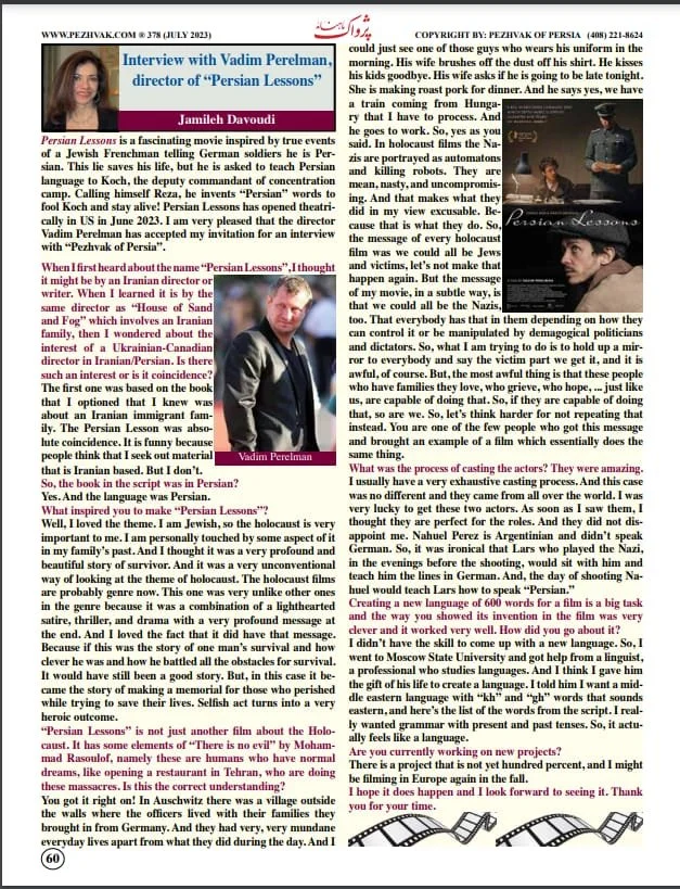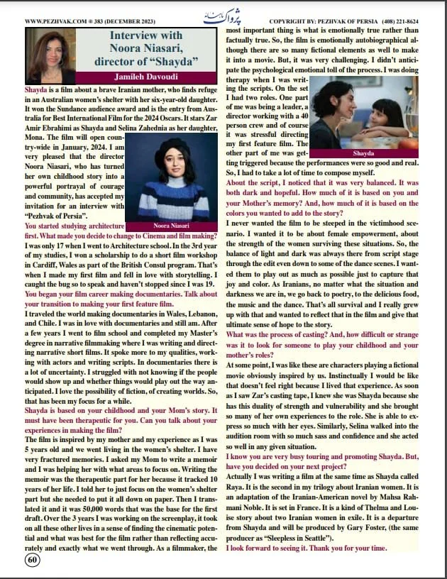 Film Articles Interview with Noora Niasari director of “Shayda” Interview with Vadim Perelman, director of “Persian Lessons” More… Reports from Iranian Women’s Studies Foundation (IWSF) Conferences IWSF 30th Conference IWSF 28th Conference More…
