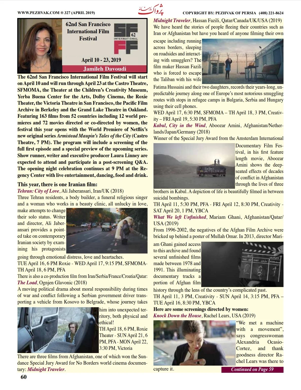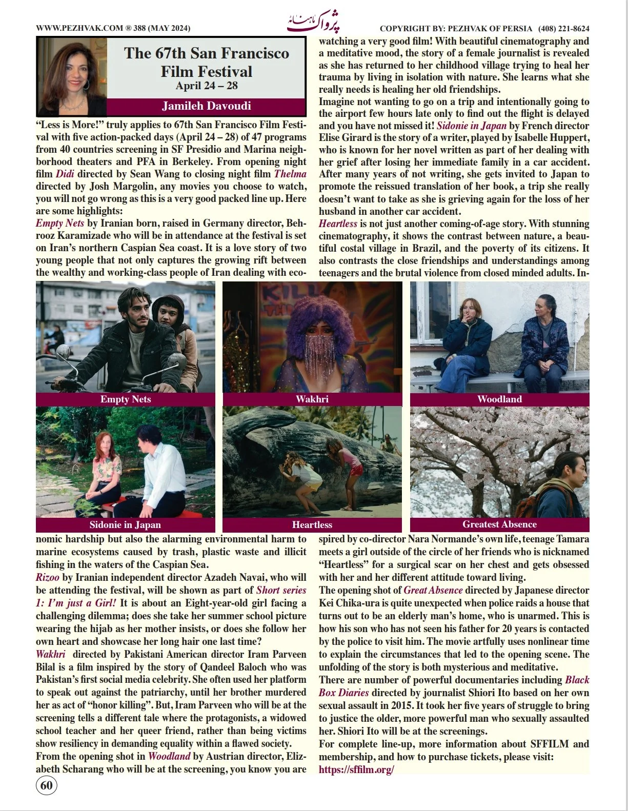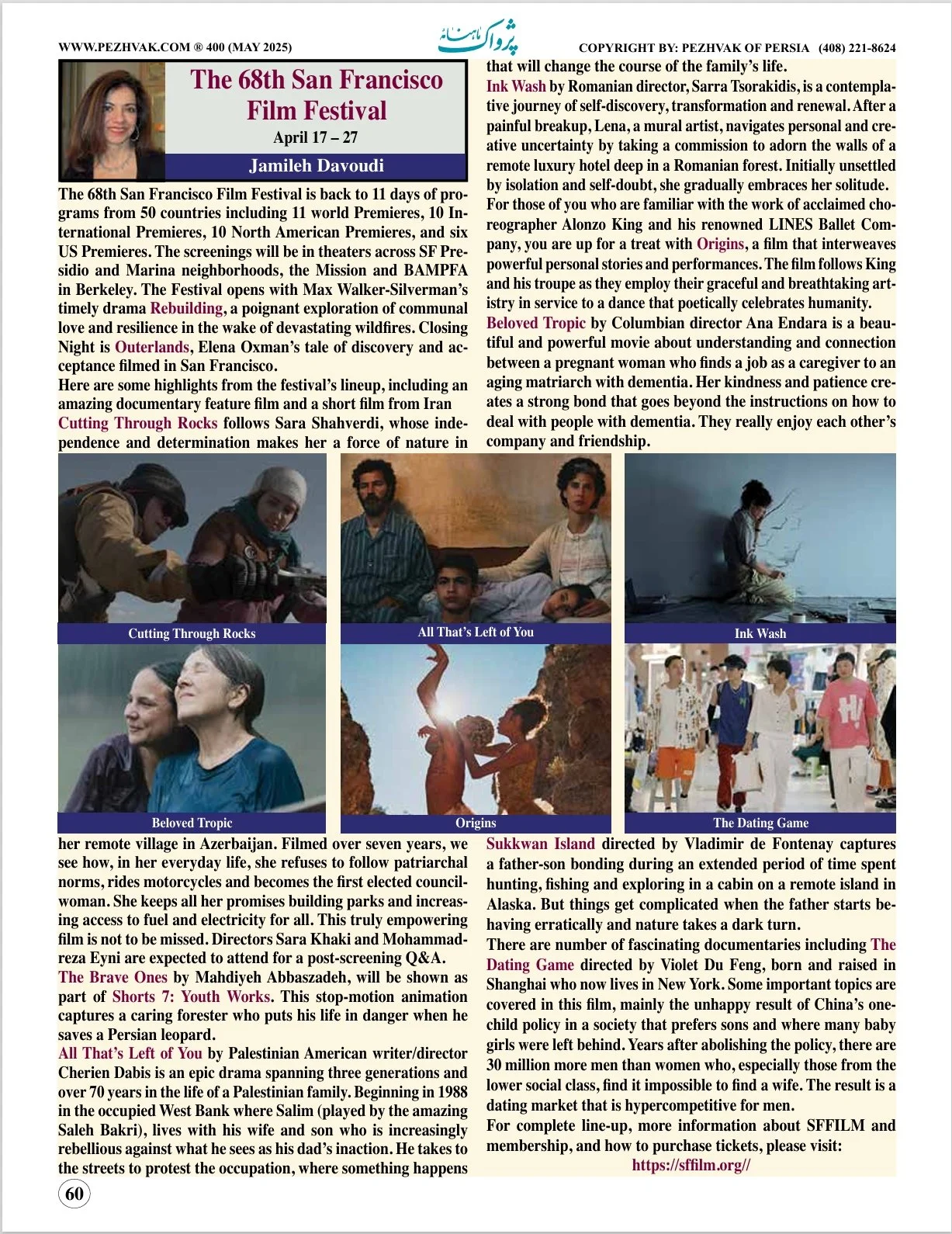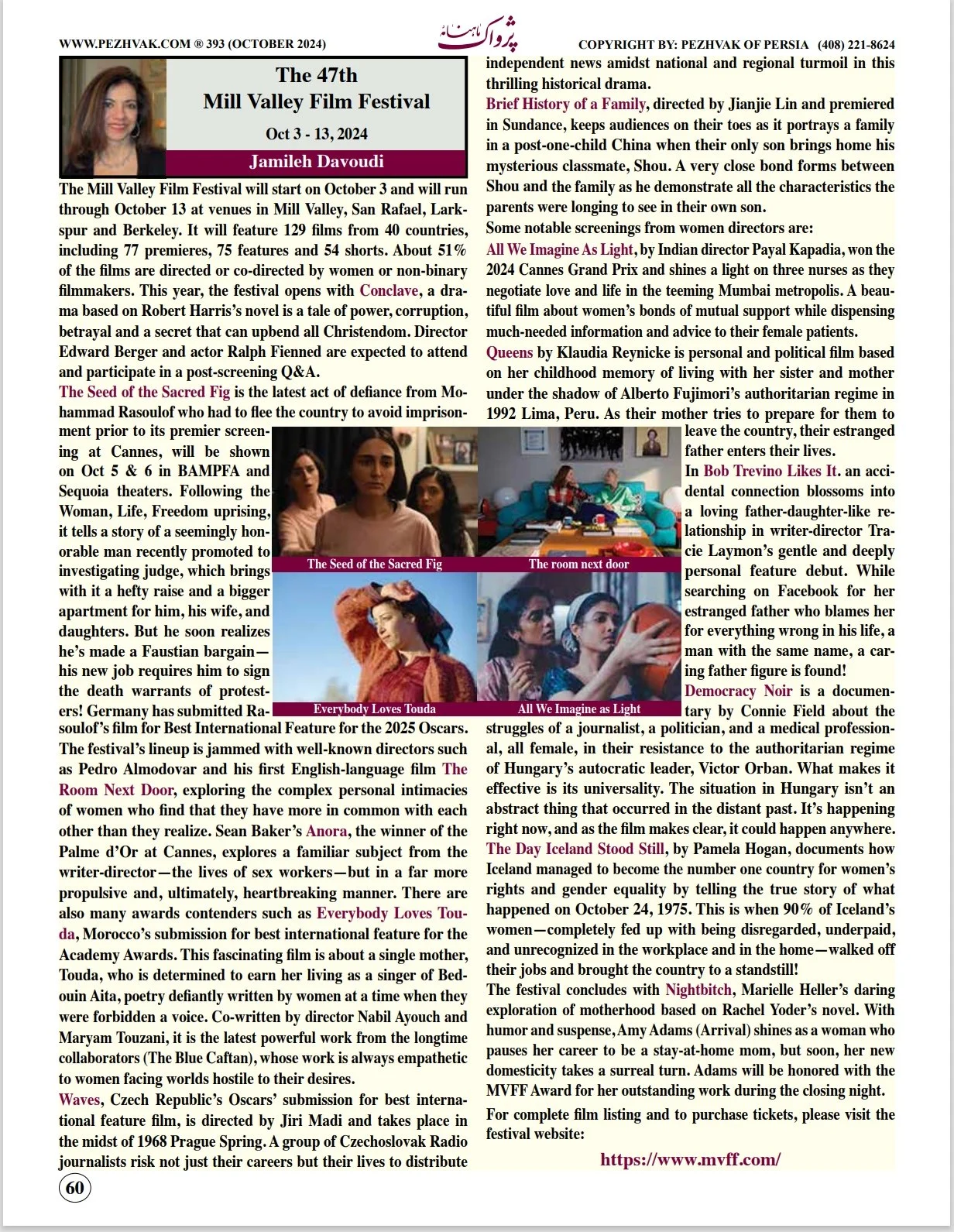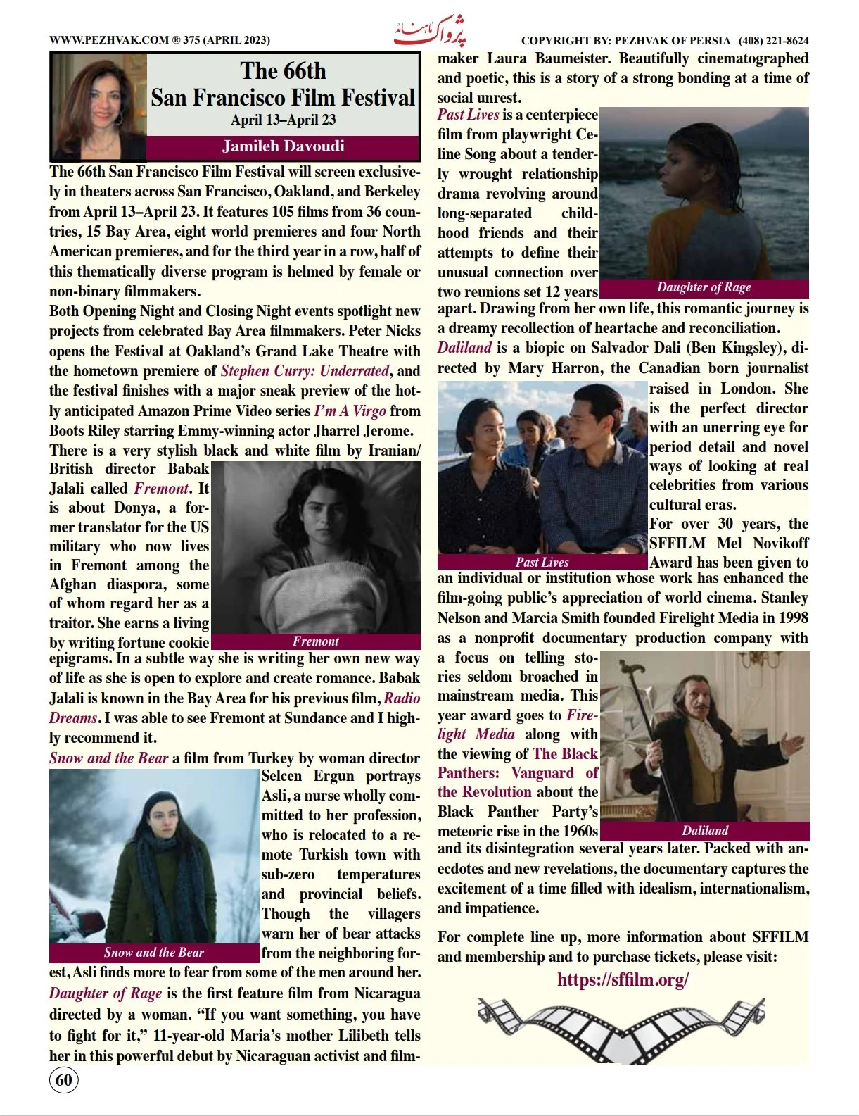 Film Articles… Interviews Interview with Mojgan Ilanlou director of “One Thousand Women” Interview with the director and star of “Me, Maryam, the Children and 26 Others” Interview with Sarra Tsorakidis, director of “Ink Wash” at SFFILM Festival Interview with the directors of “Agent of Happiness” Interview with Kaveh Tehrani director of “Listen Up!” Interview with Azadeh Navai director of “Rizoo” Interview with Kaouther Ben Hania director of “Four Daughters” Interview with Alireza Khatami director of “Terrestrial Verses” Interview with Noor Niasari director of “Shayda” Interview with Jeanne Waltz director of “Fortunate Ones” Interview with Anna Fahr director of “Valley of Exile” Interview with Vadim Perelman director of “Persian Lessons” Interview with Bani Khoshnoudi director of “Transit” Interview with the Iranian Man who Inspired the Film “The Terminal” Interview with Faran Moradi director of “Tehranto” Interview with Gayatri Kumar director of “Coffined at 15” Interview with Kurdwin Ayub director of “Sonne” Interview with Farbod Ardebili director of “Forbidden to See Us Scream in Tehran” Interviews with documentary makers of “Seyran Ates: Sex, Revolution and Islam” Interview with Sahraa Karimi director of “Hava, Maryam, Ayesha” Interview with Iranian-American Actor Sheila Vand Interview with Hossein Amini director of “Two Faces of January” Reviews The 48th Mill Valley Film Festival Growing Trend of Observational Documentaries The 68th SF Film Festival Cinejoy 2025 Cinequest 2025 Spotlight on Three Iranian Women Filmmakers Three Acclaimed Films by Iranian Directors in 2024 The 47th Mill Valley Film Festival Recap The 47th Mill Valley Film Festival Film Reviews: Daddio, Thelma. Ghostlight, Nowhere Special The 67th SF Film Festival CINEJOY 2024 Cinequest 2024 The 46th Mill Valley Film Festival Cinequest 2023 Film Review “Ballad of a White Cow” The 66th SF Film Festival Recap The 66th SF Film Festival The Oscars 2023 Sundance 2023 The 45th Mill Valley Film Festival Recap The 45th Mill Valley Film Festival Cinequest 2022 The 65th SF Film Festival + Interview with Sally Rubin director of “Mama Has a Mustache” The 44th Mill Valley Film Festival Recap The 44th Mill Valley Film Festival The 64th SF Film Festival The 42nd Mill Valley Film Festival The 62nd SF Film Festival Recap The 62nd SF Film Festival The 61st SF Film Festival The 60th SF Film Festival Recap The 60th SF Film Festival The 59th SF Film Festival Recap The 59th SF Film Festival The 58th SF Film Festival Recap The 58th SF Film Festival The 57th SF Film Festival Recap The 57th SF Film Festival