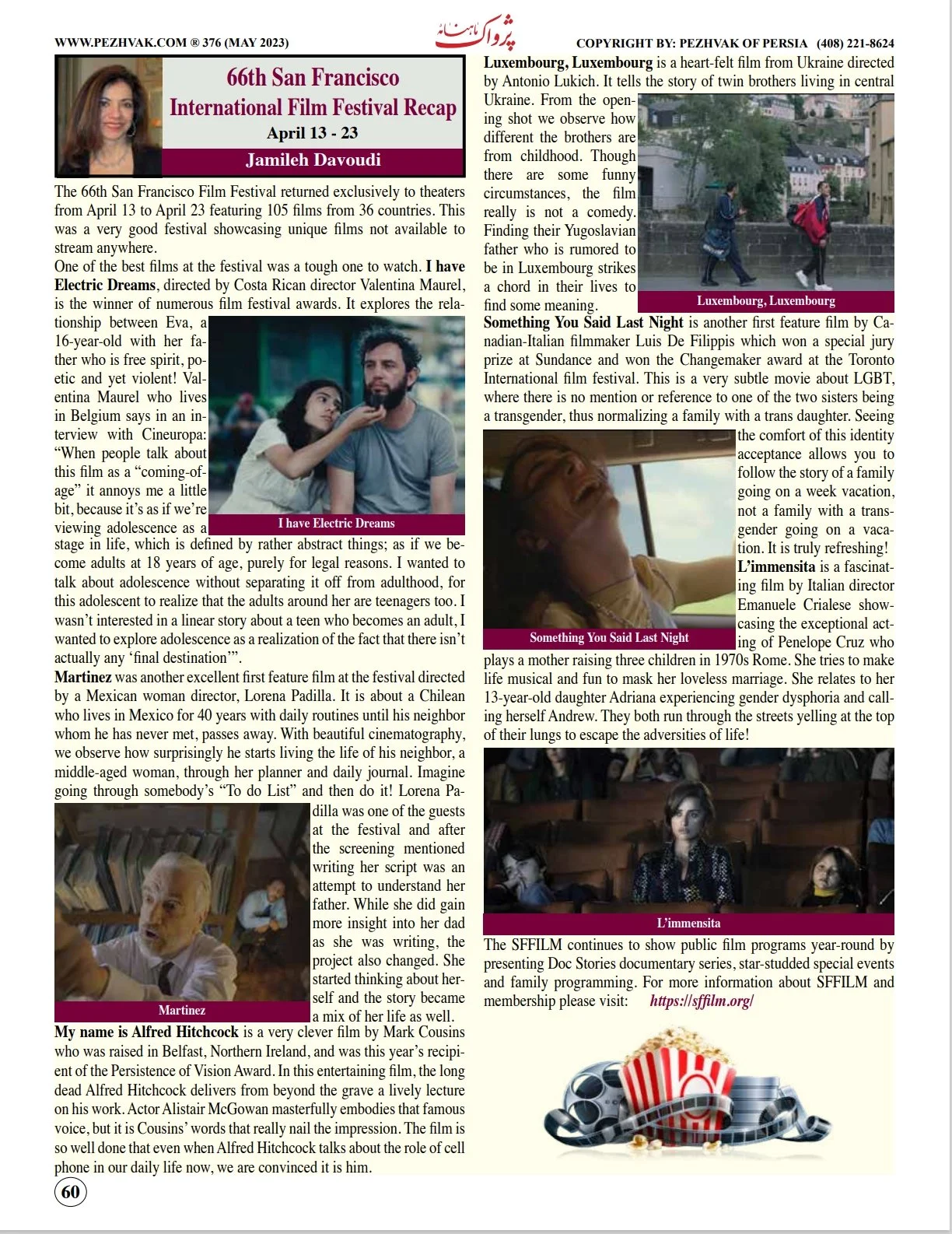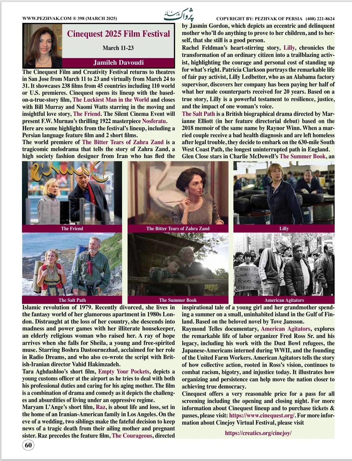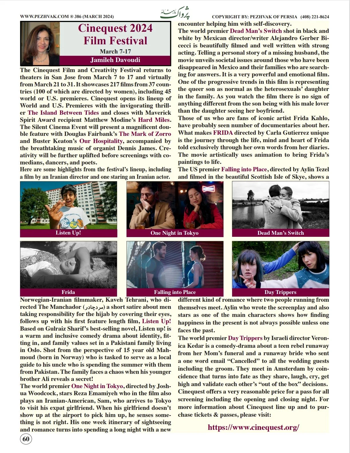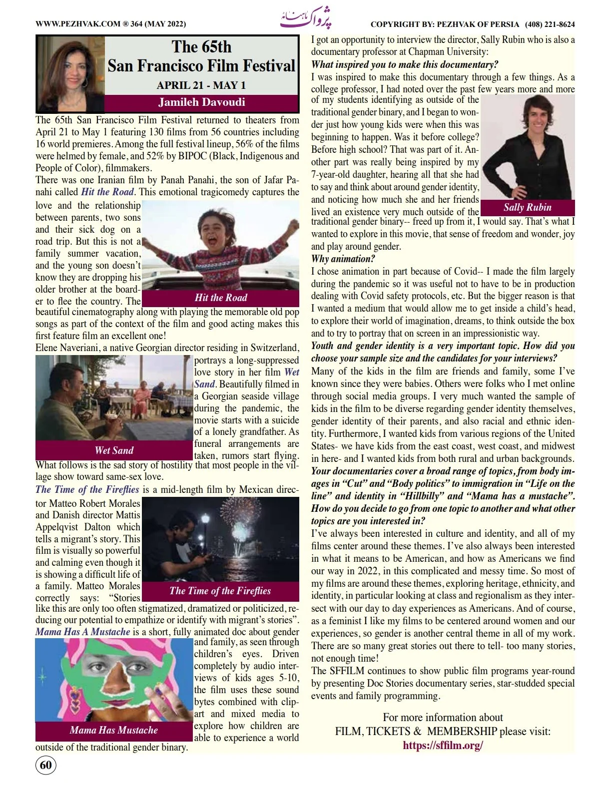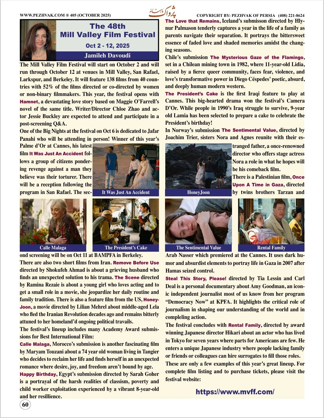 Film Articles… Interviews Interview with Mojgan Ilanlou director of “One Thousand Women” Interview with the director and star of “Me, Maryam, the Children and 26 Others” Interview with Sarra Tsorakidis, director of “Ink Wash” at SFFILM Festival Interview with the directors of “Agent of Happiness” Interview with Kaveh Tehrani director of “Listen Up!” Interview with Azadeh Navai director of “Rizoo” Interview with Kaouther Ben Hania director of “Four Daughters” Interview with Alireza Khatami director of “Terrestrial Verses” Interview with Noor Niasari director of “Shayda” Interview with Jeanne Waltz director of “Fortunate Ones” Interview with Anna Fahr director of “Valley of Exile” Interview with Vadim Perelman director of “Persian Lessons” Interview with Bani Khoshnoudi director of “Transit” Interview with the Iranian Man who Inspired the Film “The Terminal” Interview with Faran Moradi director of “Tehranto” Interview with Gayatri Kumar director of “Coffined at 15” Interview with Kurdwin Ayub director of “Sonne” Interview with Farbod Ardebili director of “Forbidden to See Us Scream in Tehran” Interviews with documentary makers of “Seyran Ates: Sex, Revolution and Islam” Interview with Sahraa Karimi director of “Hava, Maryam, Ayesha” Interview with Iranian-American Actor Sheila Vand Interview with Hossein Amini director of “Two Faces of January” Reviews The 48th Mill Valley Film Festival Growing Trend of Observational Documentaries The 68th SF Film Festival Cinejoy 2025 Cinequest 2025 Spotlight on Three Iranian Women Filmmakers Three Acclaimed Films by Iranian Directors in 2024 The 47th Mill Valley Film Festival Recap The 47th Mill Valley Film Festival Film Reviews: Daddio, Thelma. Ghostlight, Nowhere Special The 67th SF Film Festival CINEJOY 2024 Cinequest 2024 The 46th Mill Valley Film Festival Cinequest 2023 Film Review “Ballad of a White Cow” The 66th SF Film Festival Recap The 66th SF Film Festival The Oscars 2023 Sundance 2023 The 45th Mill Valley Film Festival Recap The 45th Mill Valley Film Festival Cinequest 2022 The 65th SF Film Festival + Interview with Sally Rubin director of “Mama Has a Mustache” The 44th Mill Valley Film Festival Recap The 44th Mill Valley Film Festival The 64th SF Film Festival The 42nd Mill Valley Film Festival The 62nd SF Film Festival Recap The 62nd SF Film Festival The 61st SF Film Festival The 60th SF Film Festival Recap The 60th SF Film Festival The 59th SF Film Festival Recap The 59th SF Film Festival The 58th SF Film Festival Recap The 58th SF Film Festival The 57th SF Film Festival Recap The 57th SF Film Festival