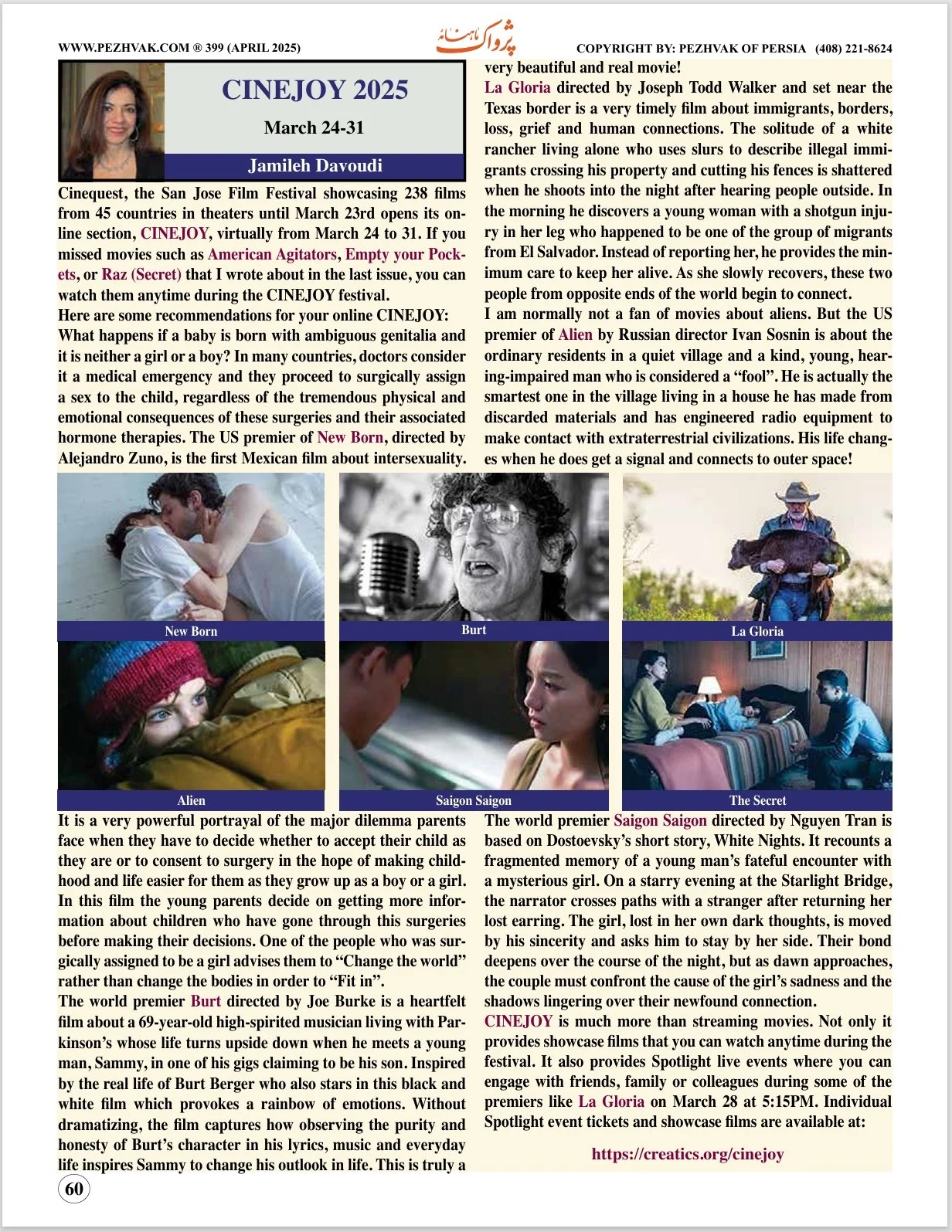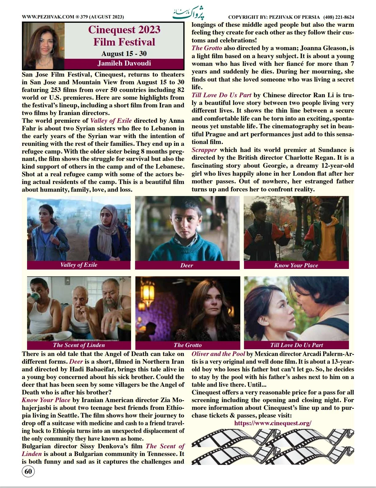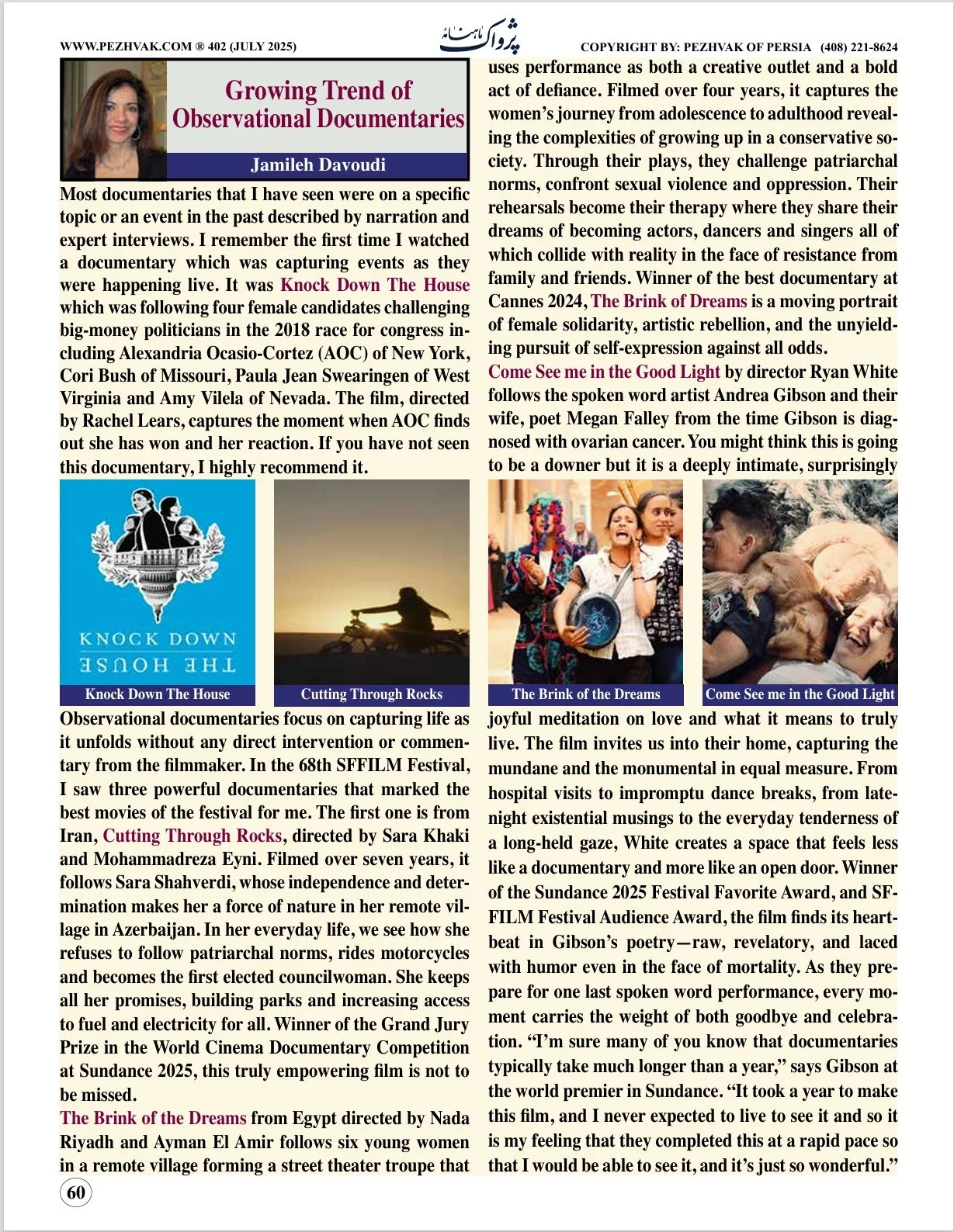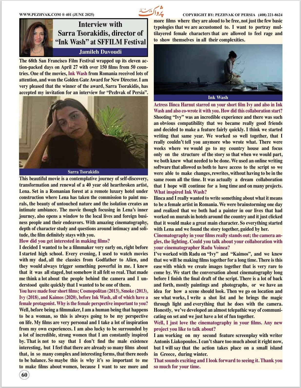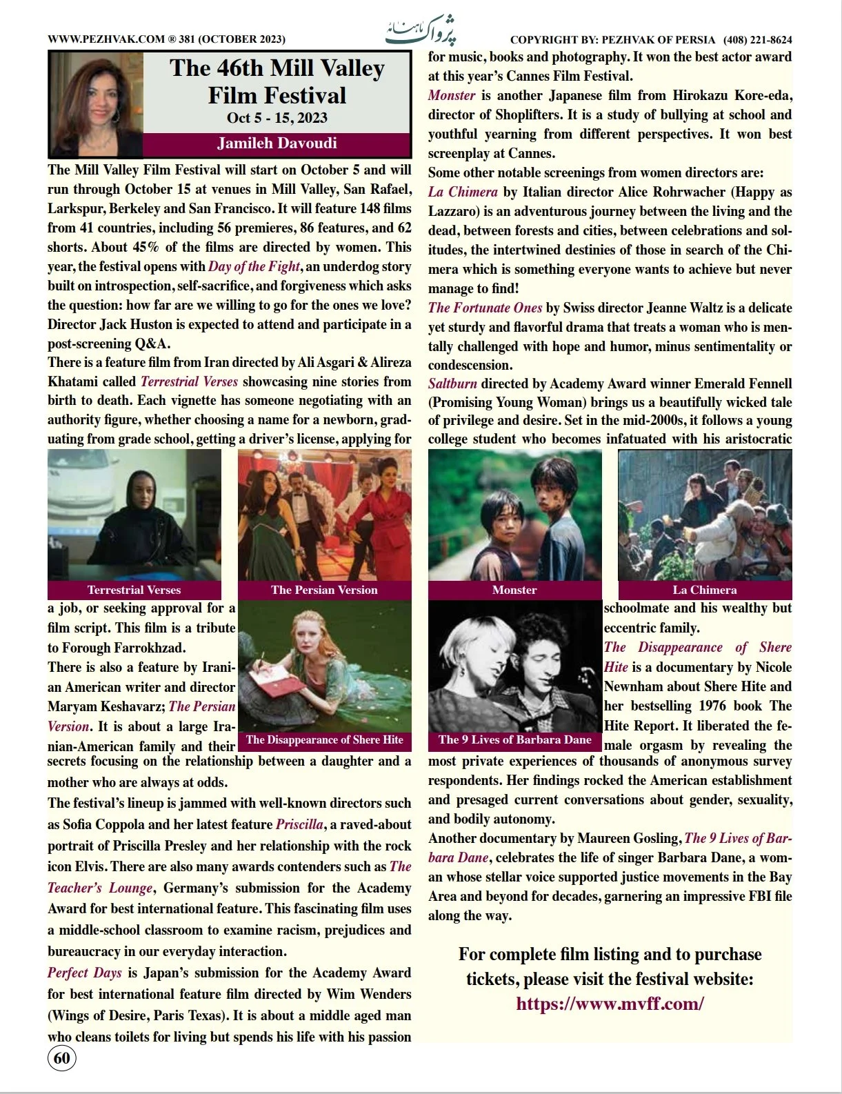 Film Articles… Interviews Interview with Mojgan Ilanlou director of “One Thousand Women” Interview with the director and star of “Me, Maryam, the Children and 26 Others” Interview with Sarra Tsorakidis, director of “Ink Wash” at SFFILM Festival Interview with the directors of “Agent of Happiness” Interview with Kaveh Tehrani director of “Listen Up!” Interview with Azadeh Navai director of “Rizoo” Interview with Kaouther Ben Hania director of “Four Daughters” Interview with Alireza Khatami director of “Terrestrial Verses” Interview with Noor Niasari director of “Shayda” Interview with Jeanne Waltz director of “Fortunate Ones” Interview with Anna Fahr director of “Valley of Exile” Interview with Vadim Perelman director of “Persian Lessons” Interview with Bani Khoshnoudi director of “Transit” Interview with the Iranian Man who Inspired the Film “The Terminal” Interview with Faran Moradi director of “Tehranto” Interview with Gayatri Kumar director of “Coffined at 15” Interview with Kurdwin Ayub director of “Sonne” Interview with Farbod Ardebili director of “Forbidden to See Us Scream in Tehran” Interviews with documentary makers of “Seyran Ates: Sex, Revolution and Islam” Interview with Sahraa Karimi director of “Hava, Maryam, Ayesha” Interview with Iranian-American Actor Sheila Vand Interview with Hossein Amini director of “Two Faces of January” Reviews The 48th Mill Valley Film Festival Growing Trend of Observational Documentaries The 68th SF Film Festival Cinejoy 2025 Cinequest 2025 Spotlight on Three Iranian Women Filmmakers Three Acclaimed Films by Iranian Directors in 2024 The 47th Mill Valley Film Festival Recap The 47th Mill Valley Film Festival Film Reviews: Daddio, Thelma. Ghostlight, Nowhere Special The 67th SF Film Festival CINEJOY 2024 Cinequest 2024 The 46th Mill Valley Film Festival Cinequest 2023 Film Review “Ballad of a White Cow” The 66th SF Film Festival Recap The 66th SF Film Festival The Oscars 2023 Sundance 2023 The 45th Mill Valley Film Festival Recap The 45th Mill Valley Film Festival Cinequest 2022 The 65th SF Film Festival + Interview with Sally Rubin director of “Mama Has a Mustache” The 44th Mill Valley Film Festival Recap The 44th Mill Valley Film Festival The 64th SF Film Festival The 42nd Mill Valley Film Festival The 62nd SF Film Festival Recap The 62nd SF Film Festival The 61st SF Film Festival The 60th SF Film Festival Recap The 60th SF Film Festival The 59th SF Film Festival Recap The 59th SF Film Festival The 58th SF Film Festival Recap The 58th SF Film Festival The 57th SF Film Festival Recap The 57th SF Film Festival