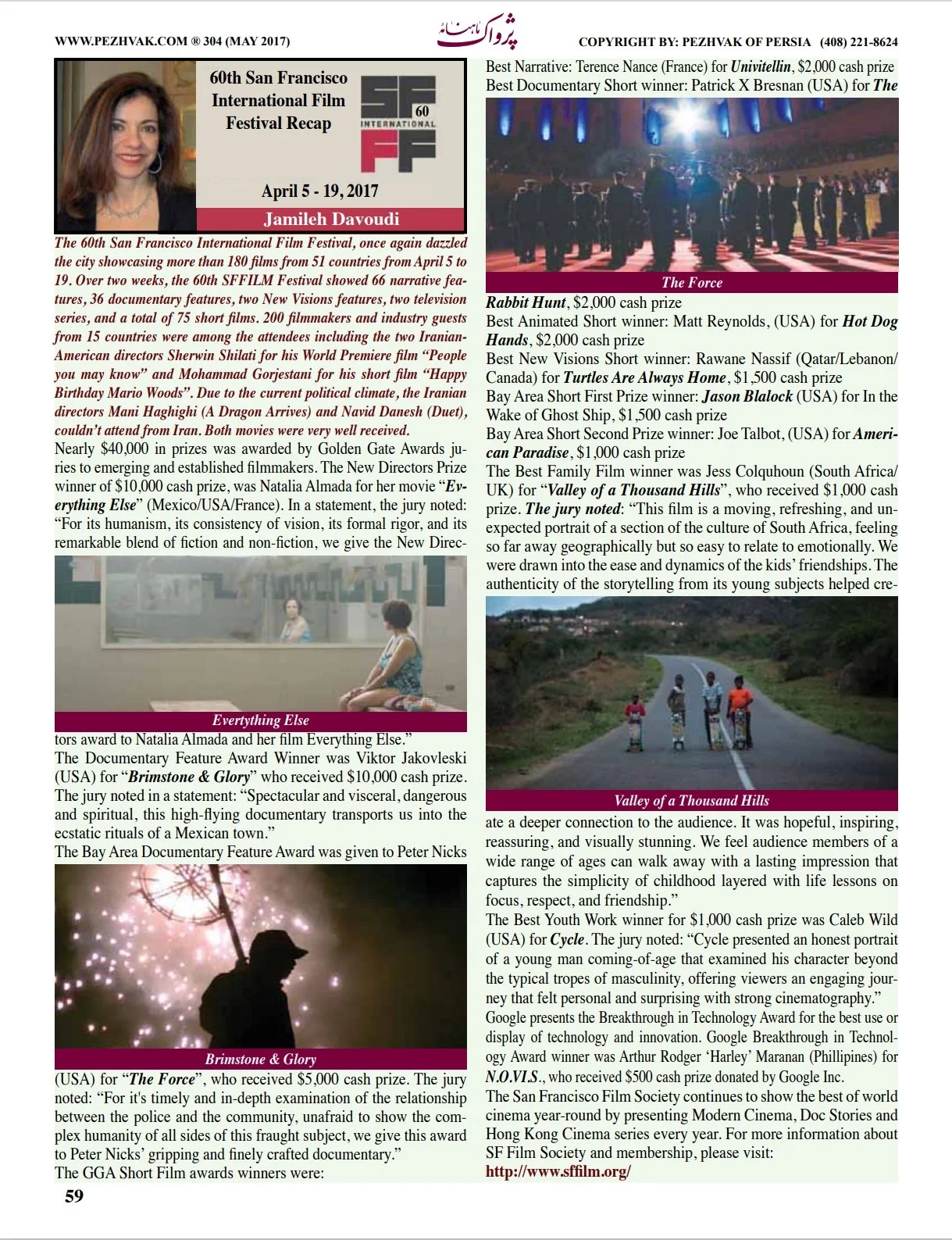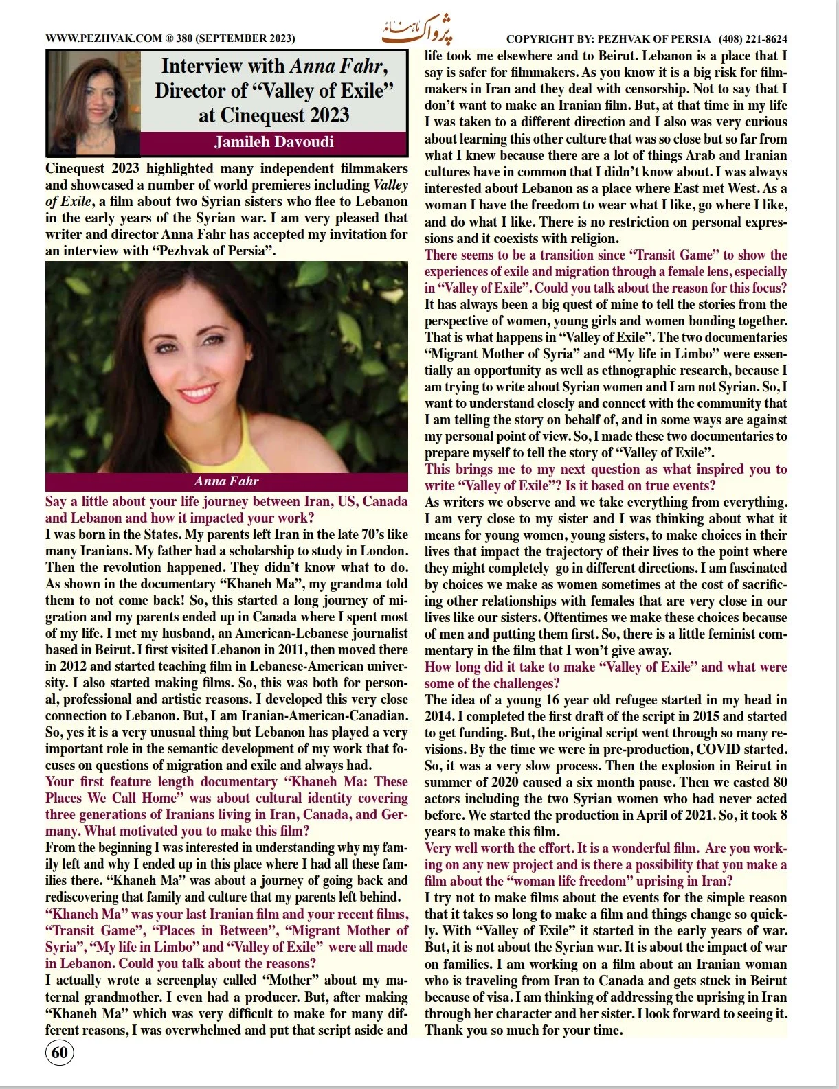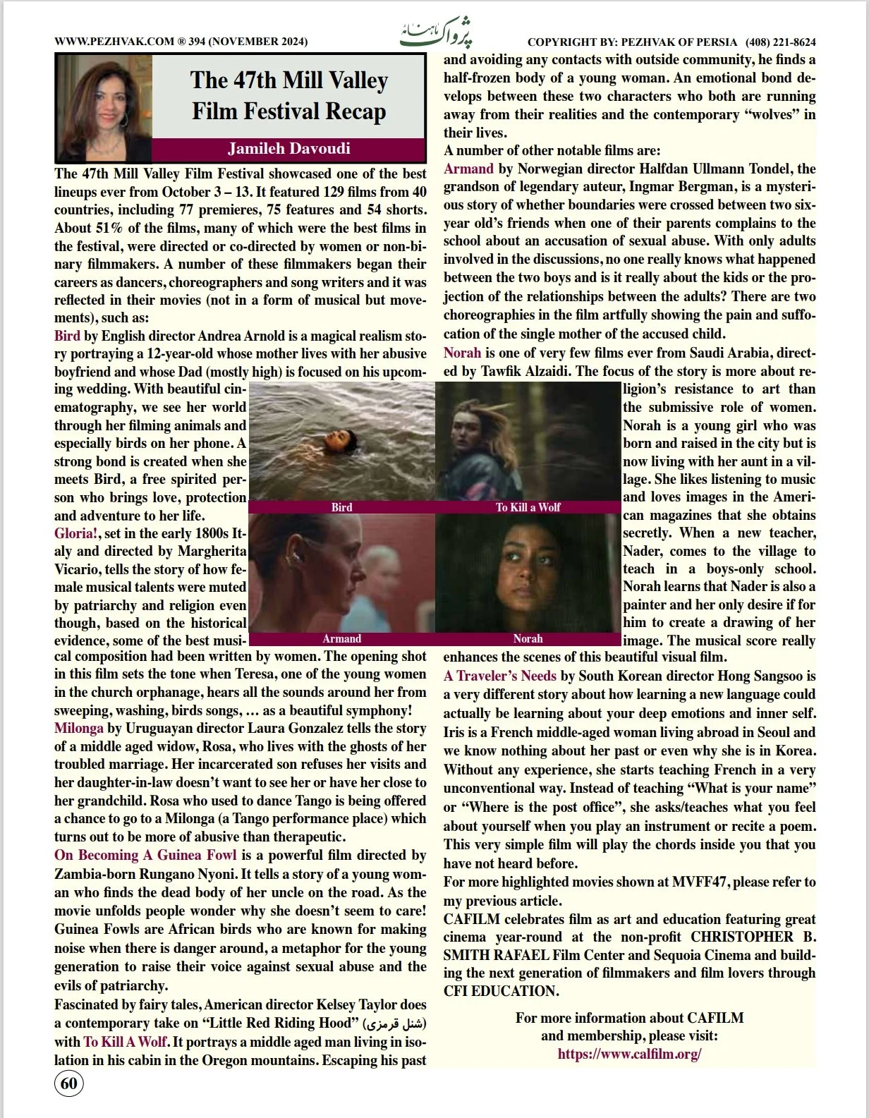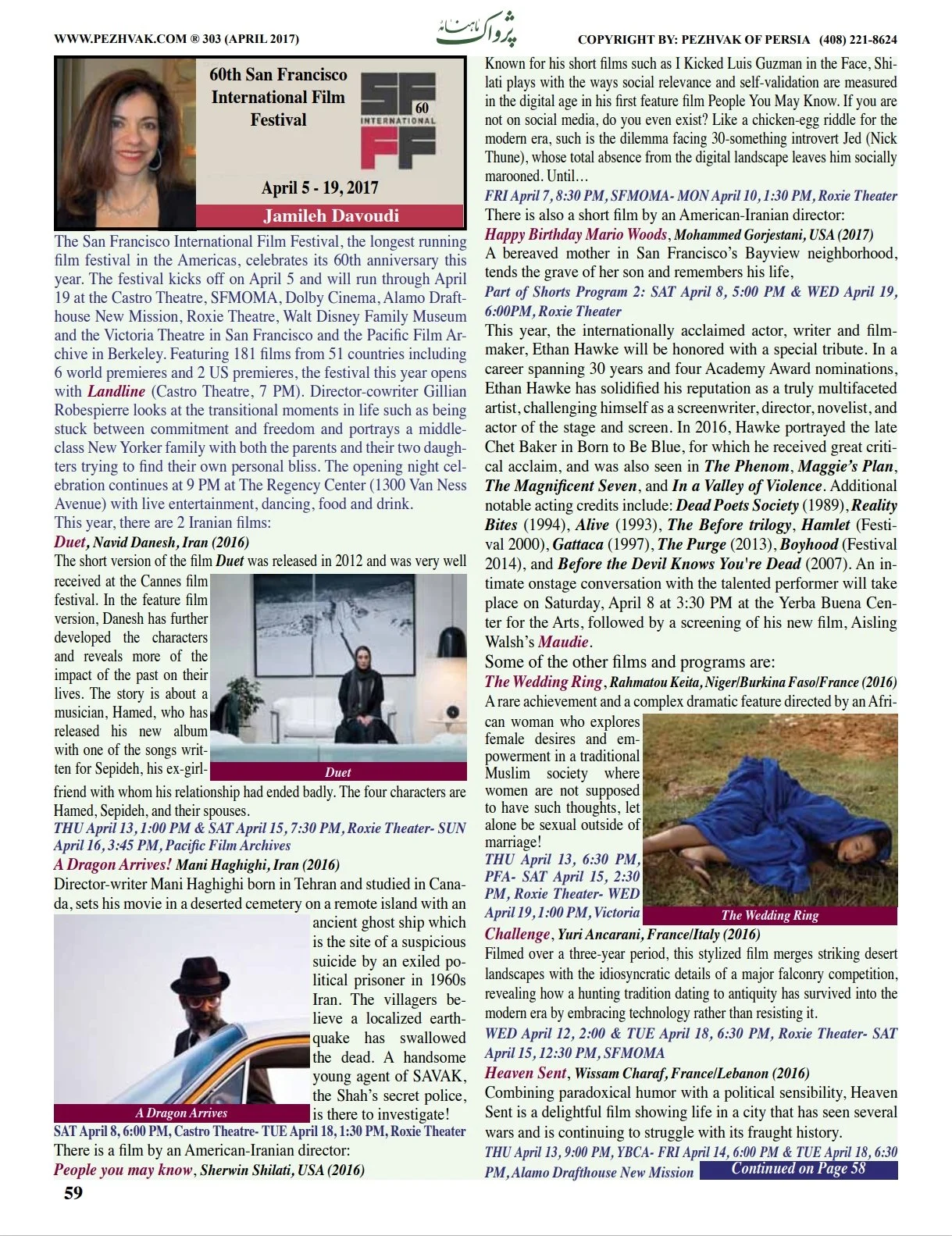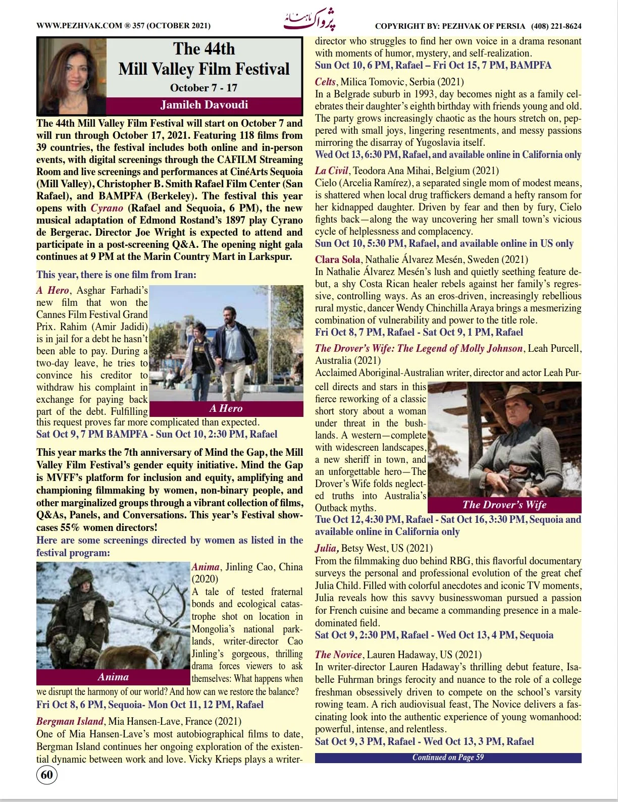 Film Articles… Interviews Interview with Mojgan Ilanlou director of “One Thousand Women” Interview with the director and star of “Me, Maryam, the Children and 26 Others” Interview with Sarra Tsorakidis, director of “Ink Wash” at SFFILM Festival Interview with the directors of “Agent of Happiness” Interview with Kaveh Tehrani director of “Listen Up!” Interview with Azadeh Navai director of “Rizoo” Interview with Kaouther Ben Hania director of “Four Daughters” Interview with Alireza Khatami director of “Terrestrial Verses” Interview with Noor Niasari director of “Shayda” Interview with Jeanne Waltz director of “Fortunate Ones” Interview with Anna Fahr director of “Valley of Exile” Interview with Vadim Perelman director of “Persian Lessons” Interview with Bani Khoshnoudi director of “Transit” Interview with the Iranian Man who Inspired the Film “The Terminal” Interview with Faran Moradi director of “Tehranto” Interview with Gayatri Kumar director of “Coffined at 15” Interview with Kurdwin Ayub director of “Sonne” Interview with Farbod Ardebili director of “Forbidden to See Us Scream in Tehran” Interviews with documentary makers of “Seyran Ates: Sex, Revolution and Islam” Interview with Sahraa Karimi director of “Hava, Maryam, Ayesha” Interview with Iranian-American Actor Sheila Vand Interview with Hossein Amini director of “Two Faces of January” Reviews The 48th Mill Valley Film Festival Growing Trend of Observational Documentaries The 68th SF Film Festival Cinejoy 2025 Cinequest 2025 Spotlight on Three Iranian Women Filmmakers Three Acclaimed Films by Iranian Directors in 2024 The 47th Mill Valley Film Festival Recap The 47th Mill Valley Film Festival Film Reviews: Daddio, Thelma. Ghostlight, Nowhere Special The 67th SF Film Festival CINEJOY 2024 Cinequest 2024 The 46th Mill Valley Film Festival Cinequest 2023 Film Review “Ballad of a White Cow” The 66th SF Film Festival Recap The 66th SF Film Festival The Oscars 2023 Sundance 2023 The 45th Mill Valley Film Festival Recap The 45th Mill Valley Film Festival Cinequest 2022 The 65th SF Film Festival + Interview with Sally Rubin director of “Mama Has a Mustache” The 44th Mill Valley Film Festival Recap The 44th Mill Valley Film Festival The 64th SF Film Festival The 42nd Mill Valley Film Festival The 62nd SF Film Festival Recap The 62nd SF Film Festival The 61st SF Film Festival The 60th SF Film Festival Recap The 60th SF Film Festival The 59th SF Film Festival Recap The 59th SF Film Festival The 58th SF Film Festival Recap The 58th SF Film Festival The 57th SF Film Festival Recap The 57th SF Film Festival