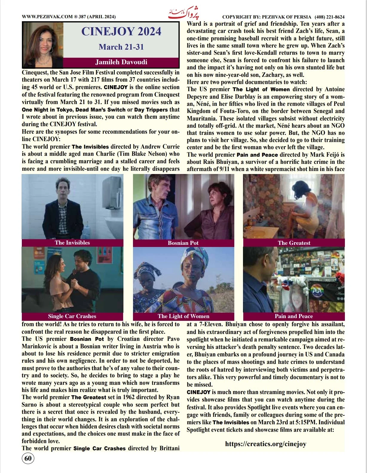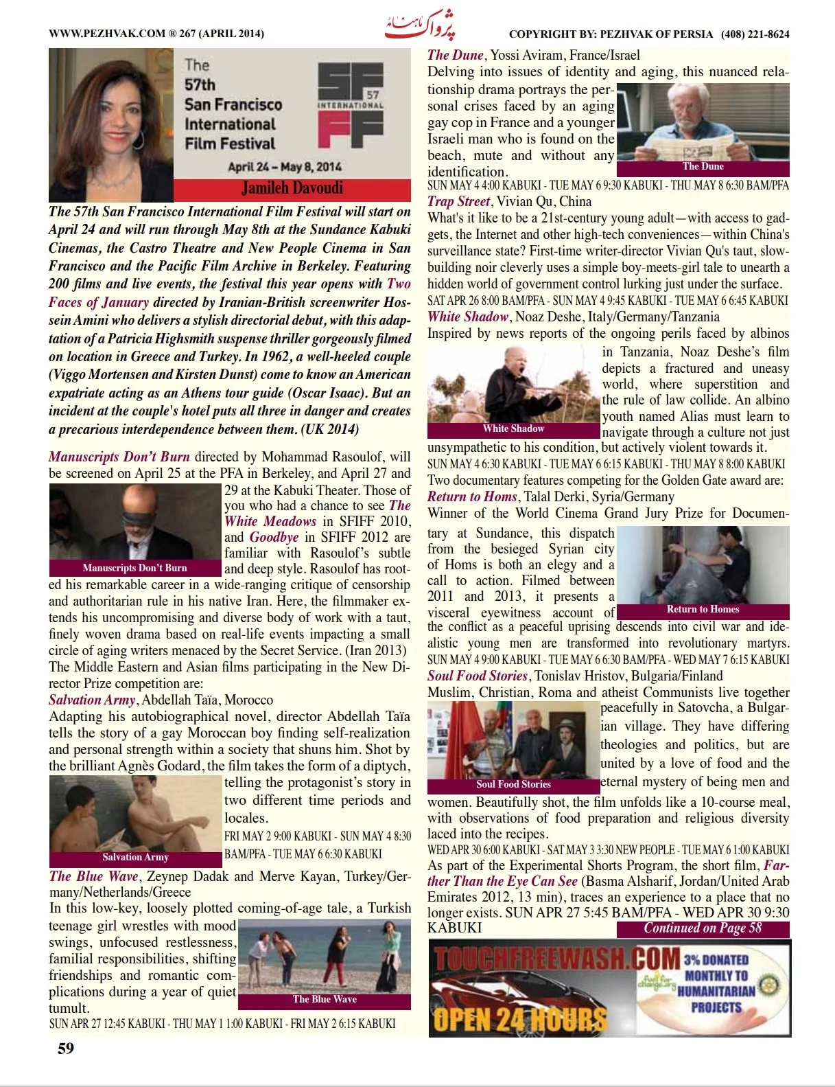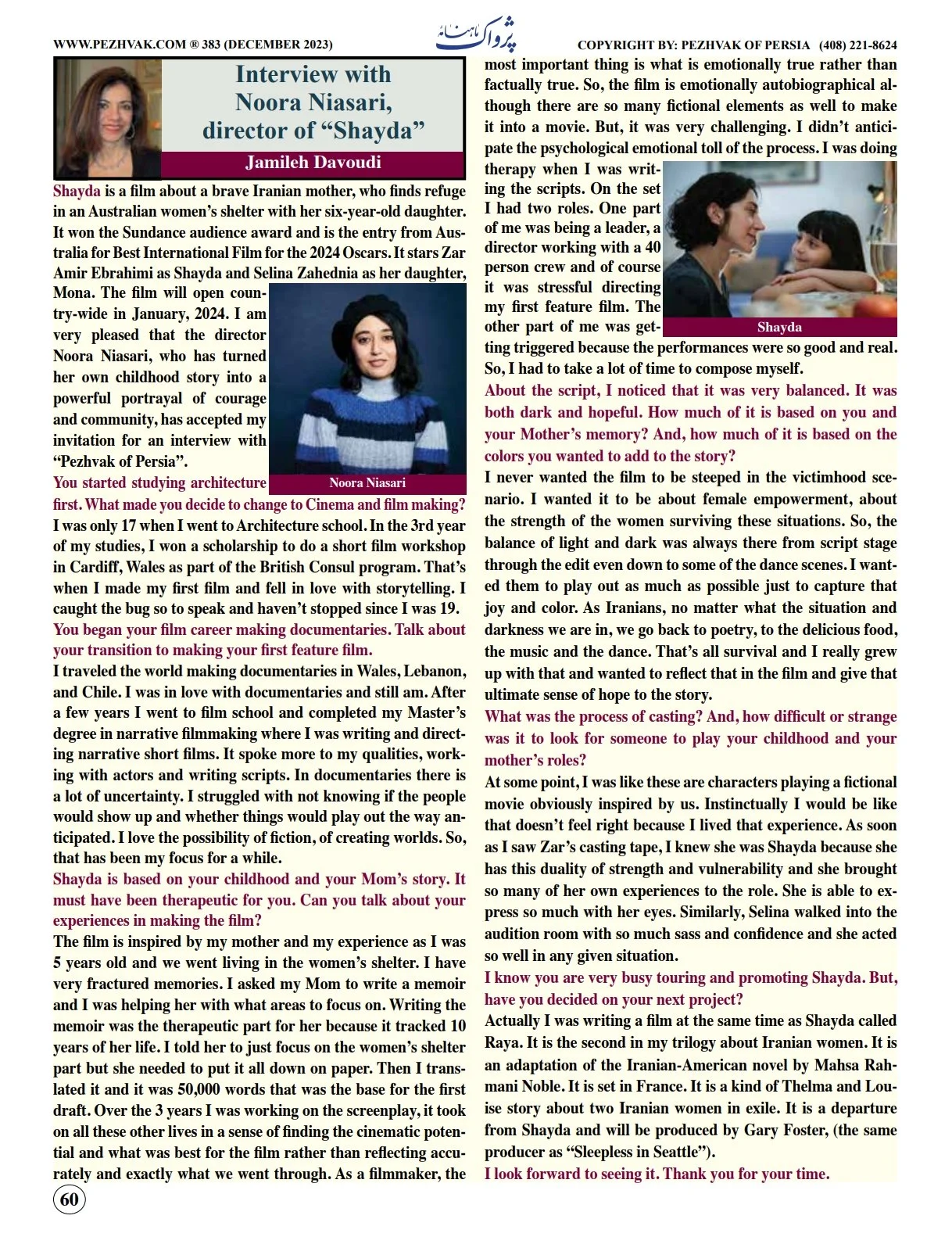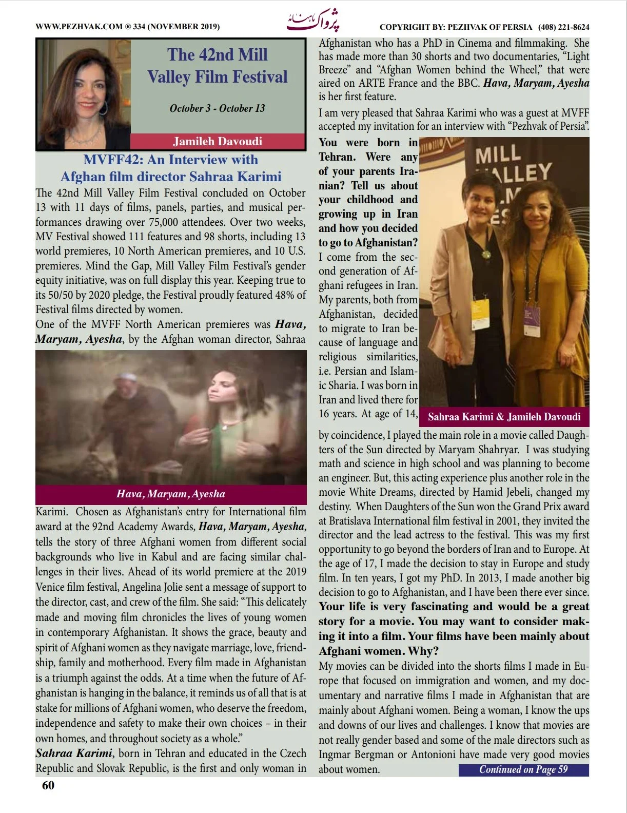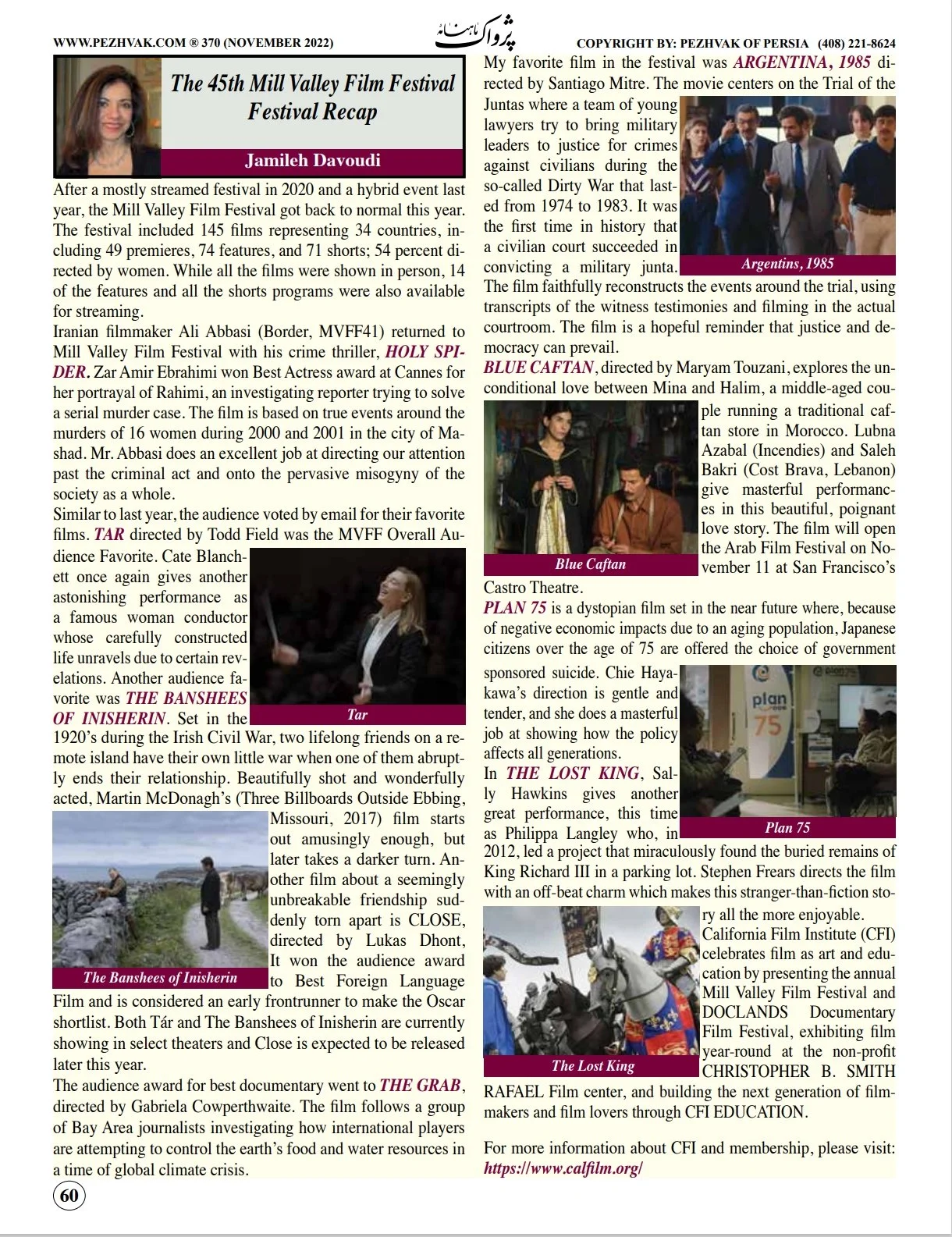 Film Articles… Interviews Interview with Mojgan Ilanlou director of “One Thousand Women” Interview with the director and star of “Me, Maryam, the Children and 26 Others” Interview with Sarra Tsorakidis, director of “Ink Wash” at SFFILM Festival Interview with the directors of “Agent of Happiness” Interview with Kaveh Tehrani director of “Listen Up!” Interview with Azadeh Navai director of “Rizoo” Interview with Kaouther Ben Hania director of “Four Daughters” Interview with Alireza Khatami director of “Terrestrial Verses” Interview with Noor Niasari director of “Shayda” Interview with Jeanne Waltz director of “Fortunate Ones” Interview with Anna Fahr director of “Valley of Exile” Interview with Vadim Perelman director of “Persian Lessons” Interview with Bani Khoshnoudi director of “Transit” Interview with the Iranian Man who Inspired the Film “The Terminal” Interview with Faran Moradi director of “Tehranto” Interview with Gayatri Kumar director of “Coffined at 15” Interview with Kurdwin Ayub director of “Sonne” Interview with Farbod Ardebili director of “Forbidden to See Us Scream in Tehran” Interviews with documentary makers of “Seyran Ates: Sex, Revolution and Islam” Interview with Sahraa Karimi director of “Hava, Maryam, Ayesha” Interview with Iranian-American Actor Sheila Vand Interview with Hossein Amini director of “Two Faces of January” Reviews The 48th Mill Valley Film Festival Growing Trend of Observational Documentaries The 68th SF Film Festival Cinejoy 2025 Cinequest 2025 Spotlight on Three Iranian Women Filmmakers Three Acclaimed Films by Iranian Directors in 2024 The 47th Mill Valley Film Festival Recap The 47th Mill Valley Film Festival Film Reviews: Daddio, Thelma. Ghostlight, Nowhere Special The 67th SF Film Festival CINEJOY 2024 Cinequest 2024 The 46th Mill Valley Film Festival Cinequest 2023 Film Review “Ballad of a White Cow” The 66th SF Film Festival Recap The 66th SF Film Festival The Oscars 2023 Sundance 2023 The 45th Mill Valley Film Festival Recap The 45th Mill Valley Film Festival Cinequest 2022 The 65th SF Film Festival + Interview with Sally Rubin director of “Mama Has a Mustache” The 44th Mill Valley Film Festival Recap The 44th Mill Valley Film Festival The 64th SF Film Festival The 42nd Mill Valley Film Festival The 62nd SF Film Festival Recap The 62nd SF Film Festival The 61st SF Film Festival The 60th SF Film Festival Recap The 60th SF Film Festival The 59th SF Film Festival Recap The 59th SF Film Festival The 58th SF Film Festival Recap The 58th SF Film Festival The 57th SF Film Festival Recap The 57th SF Film Festival
