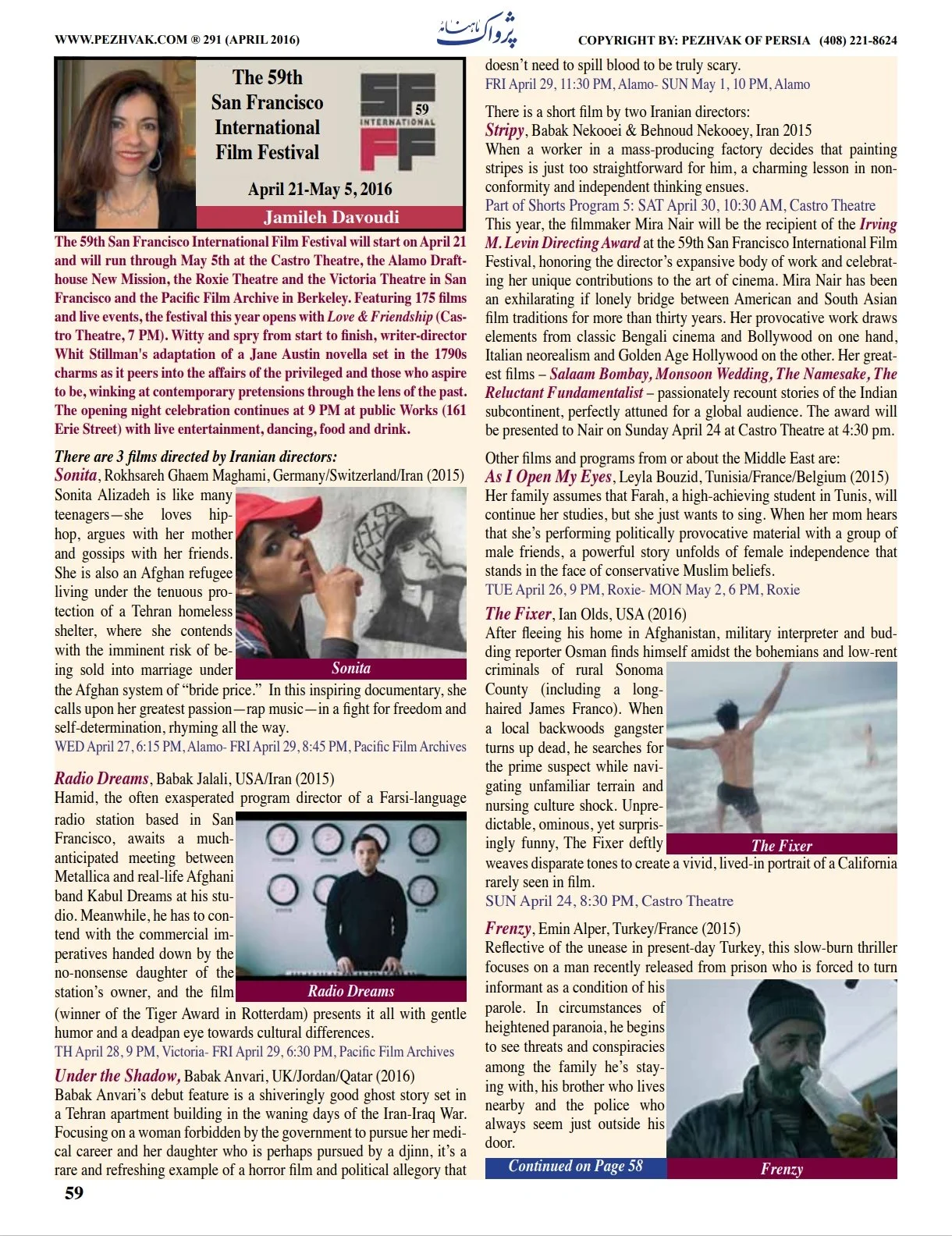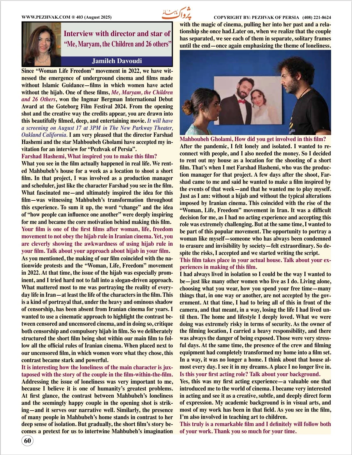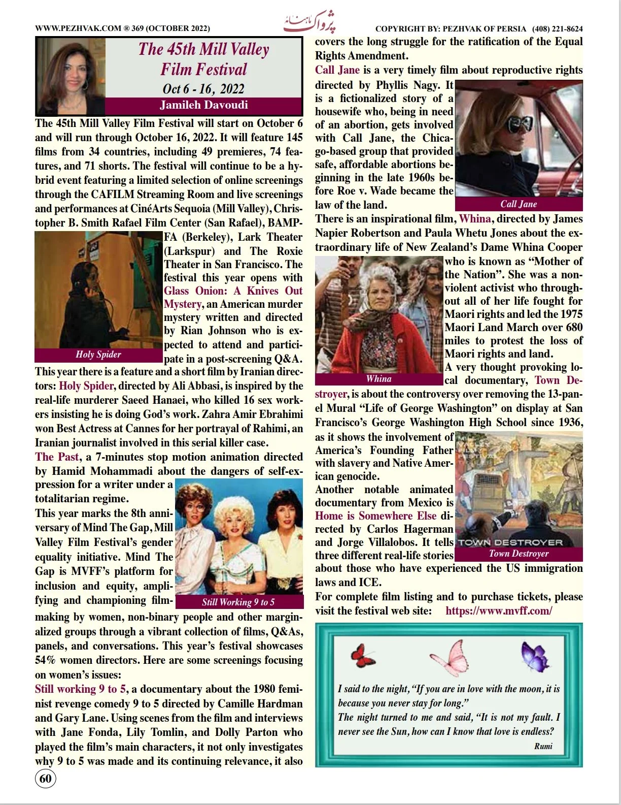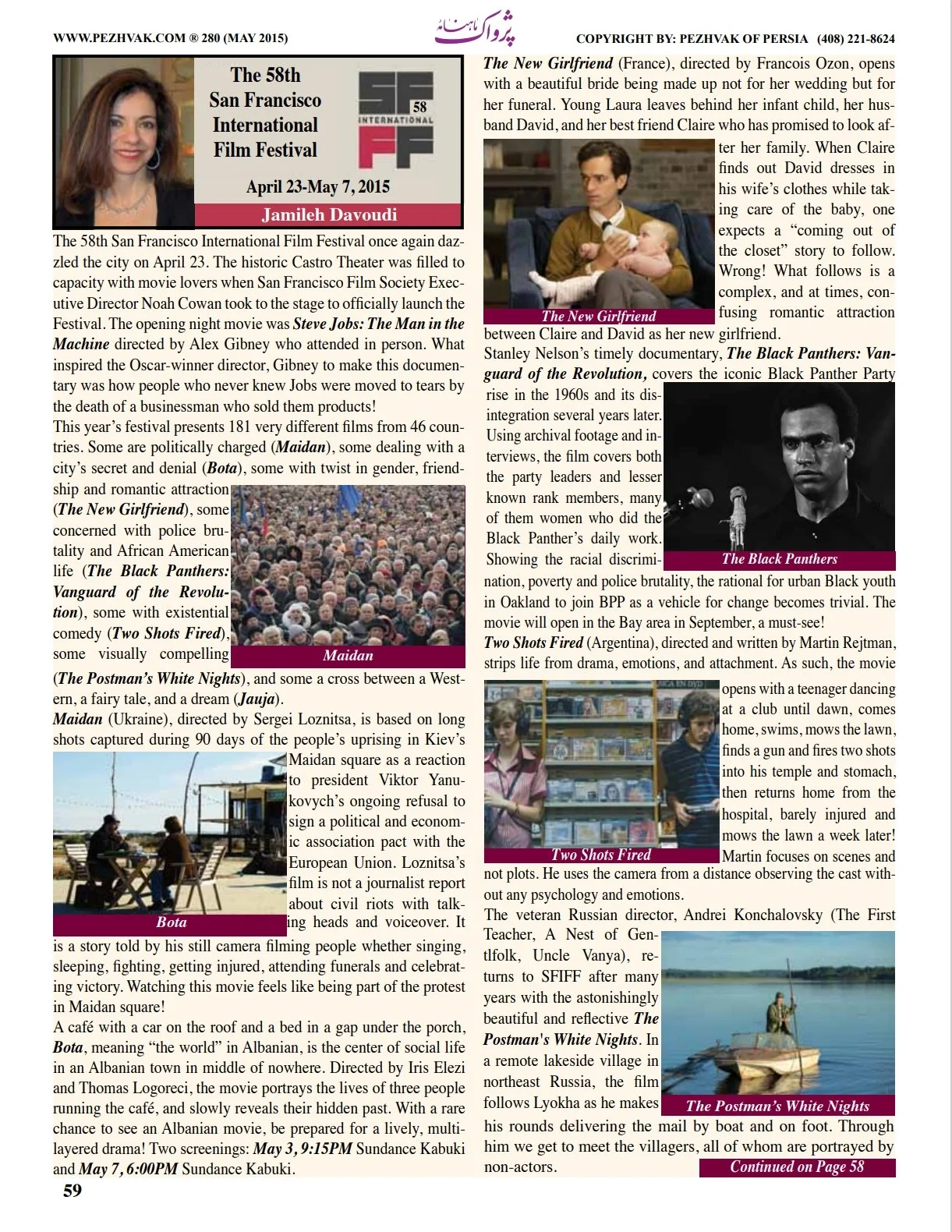 Film Articles… Interviews Interview with Mojgan Ilanlou director of “One Thousand Women” Interview with the director and star of “Me, Maryam, the Children and 26 Others” Interview with Sarra Tsorakidis, director of “Ink Wash” at SFFILM Festival Interview with the directors of “Agent of Happiness” Interview with Kaveh Tehrani director of “Listen Up!” Interview with Azadeh Navai director of “Rizoo” Interview with Kaouther Ben Hania director of “Four Daughters” Interview with Alireza Khatami director of “Terrestrial Verses” Interview with Noor Niasari director of “Shayda” Interview with Jeanne Waltz director of “Fortunate Ones” Interview with Anna Fahr director of “Valley of Exile” Interview with Vadim Perelman director of “Persian Lessons” Interview with Bani Khoshnoudi director of “Transit” Interview with the Iranian Man who Inspired the Film “The Terminal” Interview with Faran Moradi director of “Tehranto” Interview with Gayatri Kumar director of “Coffined at 15” Interview with Kurdwin Ayub director of “Sonne” Interview with Farbod Ardebili director of “Forbidden to See Us Scream in Tehran” Interviews with documentary makers of “Seyran Ates: Sex, Revolution and Islam” Interview with Sahraa Karimi director of “Hava, Maryam, Ayesha” Interview with Iranian-American Actor Sheila Vand Interview with Hossein Amini director of “Two Faces of January” Reviews The 48th Mill Valley Film Festival Growing Trend of Observational Documentaries The 68th SF Film Festival Cinejoy 2025 Cinequest 2025 Spotlight on Three Iranian Women Filmmakers Three Acclaimed Films by Iranian Directors in 2024 The 47th Mill Valley Film Festival Recap The 47th Mill Valley Film Festival Film Reviews: Daddio, Thelma. Ghostlight, Nowhere Special The 67th SF Film Festival CINEJOY 2024 Cinequest 2024 The 46th Mill Valley Film Festival Cinequest 2023 Film Review “Ballad of a White Cow” The 66th SF Film Festival Recap The 66th SF Film Festival The Oscars 2023 Sundance 2023 The 45th Mill Valley Film Festival Recap The 45th Mill Valley Film Festival Cinequest 2022 The 65th SF Film Festival + Interview with Sally Rubin director of “Mama Has a Mustache” The 44th Mill Valley Film Festival Recap The 44th Mill Valley Film Festival The 64th SF Film Festival The 42nd Mill Valley Film Festival The 62nd SF Film Festival Recap The 62nd SF Film Festival The 61st SF Film Festival The 60th SF Film Festival Recap The 60th SF Film Festival The 59th SF Film Festival Recap The 59th SF Film Festival The 58th SF Film Festival Recap The 58th SF Film Festival The 57th SF Film Festival Recap The 57th SF Film Festival