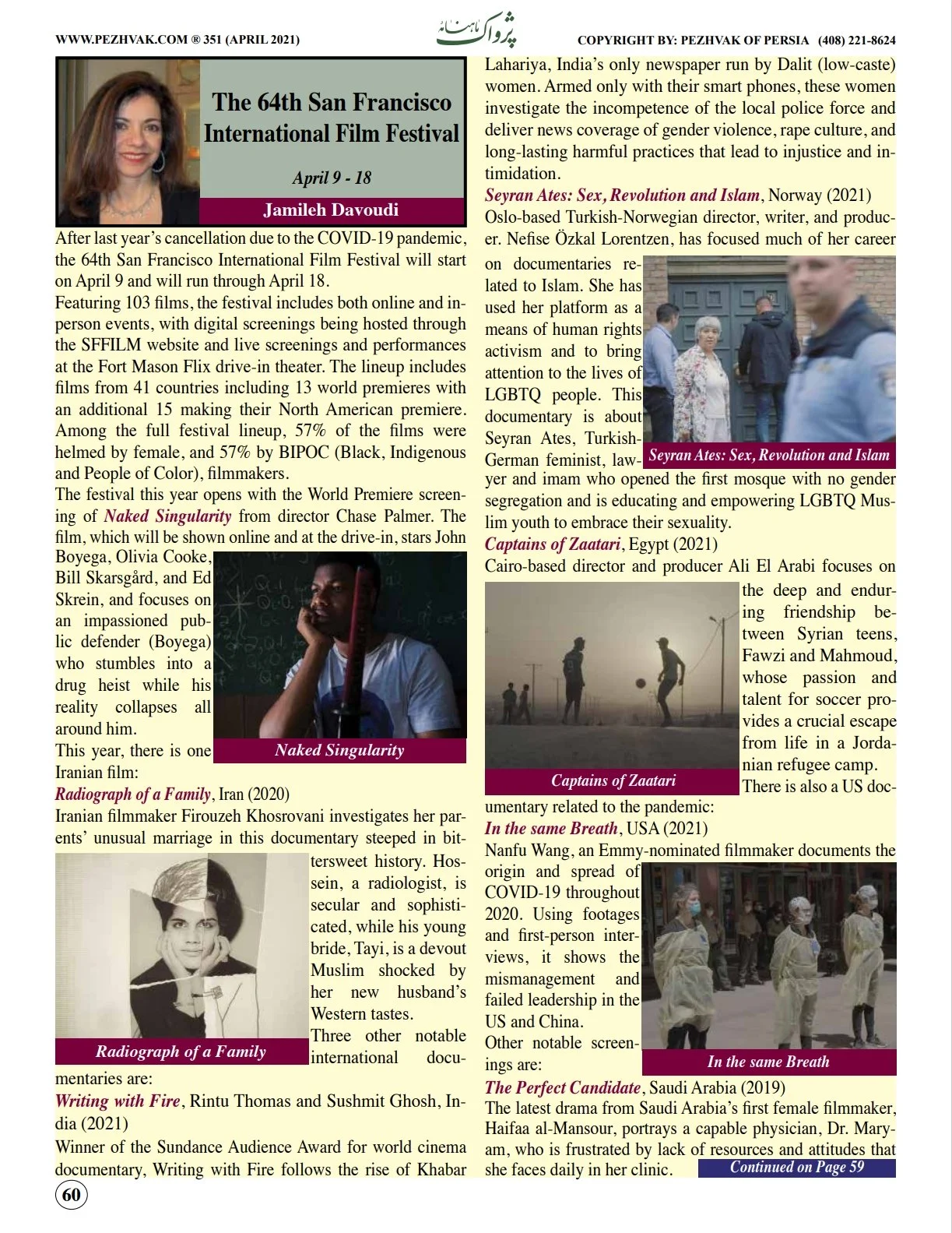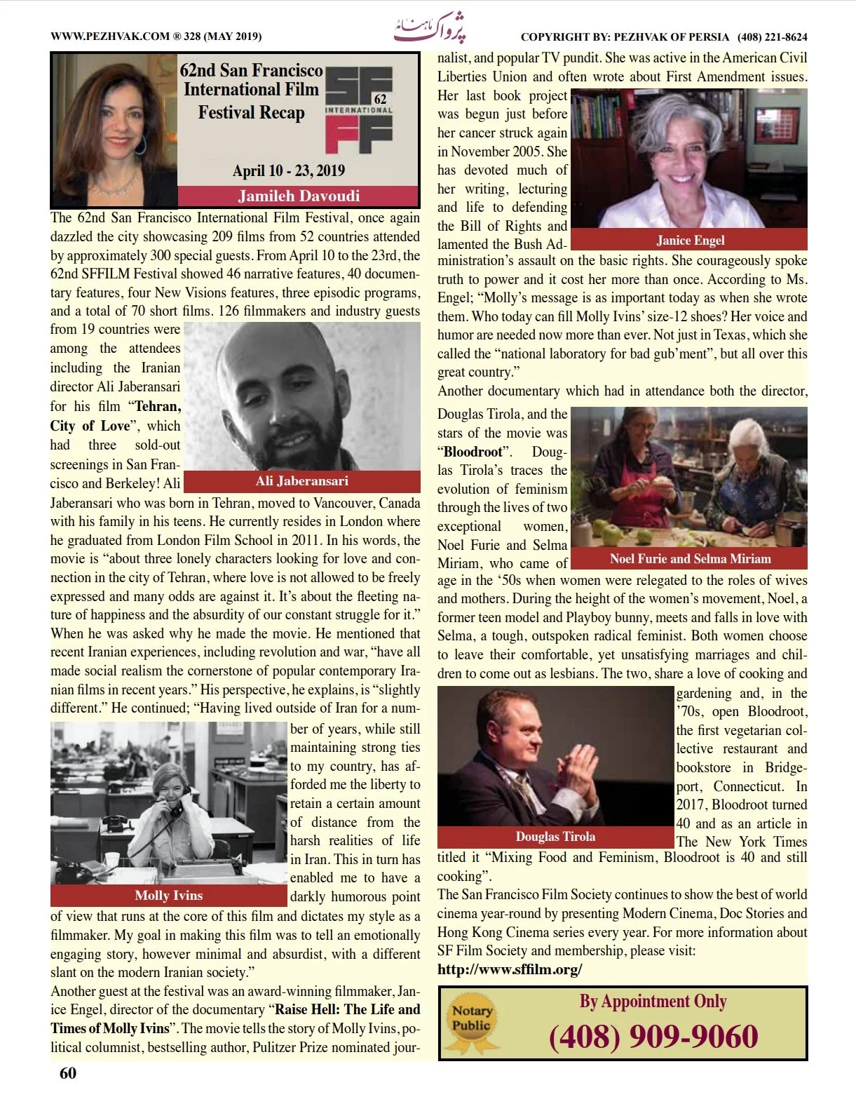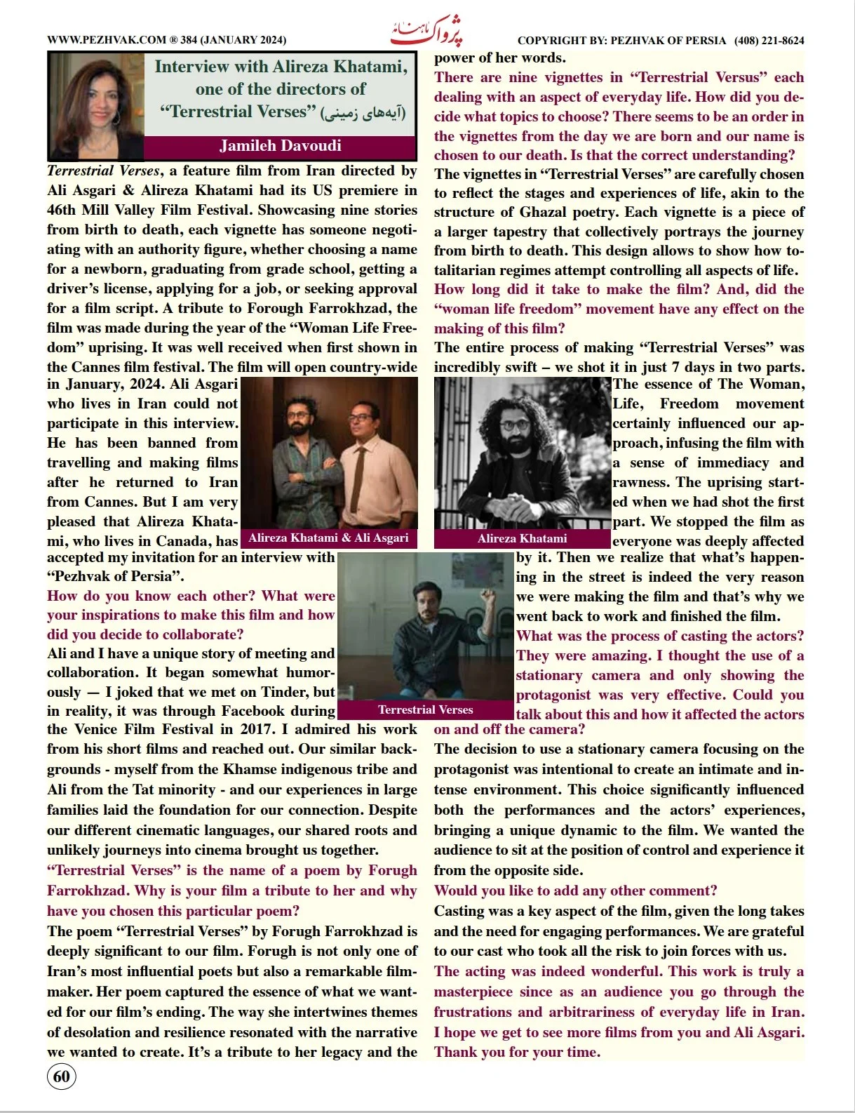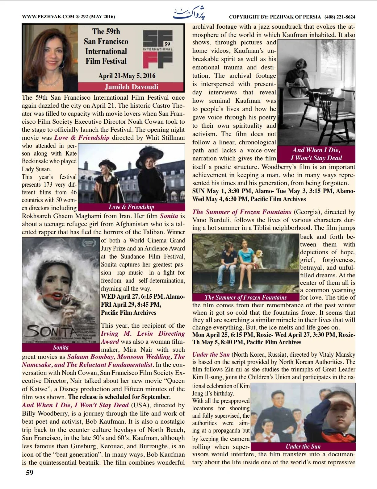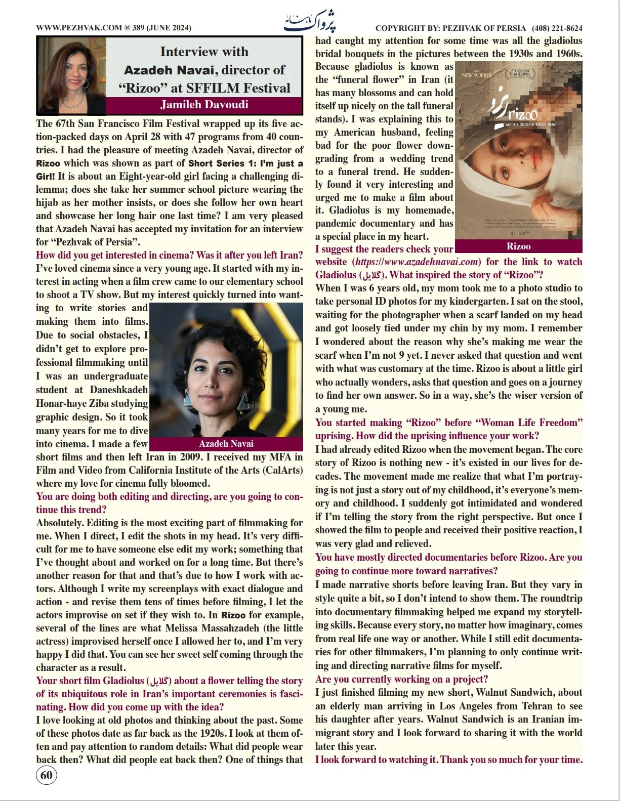 Film Articles… Interviews Interview with Mojgan Ilanlou director of “One Thousand Women” Interview with the director and star of “Me, Maryam, the Children and 26 Others” Interview with Sarra Tsorakidis, director of “Ink Wash” at SFFILM Festival Interview with the directors of “Agent of Happiness” Interview with Kaveh Tehrani director of “Listen Up!” Interview with Azadeh Navai director of “Rizoo” Interview with Kaouther Ben Hania director of “Four Daughters” Interview with Alireza Khatami director of “Terrestrial Verses” Interview with Noor Niasari director of “Shayda” Interview with Jeanne Waltz director of “Fortunate Ones” Interview with Anna Fahr director of “Valley of Exile” Interview with Vadim Perelman director of “Persian Lessons” Interview with Bani Khoshnoudi director of “Transit” Interview with the Iranian Man who Inspired the Film “The Terminal” Interview with Faran Moradi director of “Tehranto” Interview with Gayatri Kumar director of “Coffined at 15” Interview with Kurdwin Ayub director of “Sonne” Interview with Farbod Ardebili director of “Forbidden to See Us Scream in Tehran” Interviews with documentary makers of “Seyran Ates: Sex, Revolution and Islam” Interview with Sahraa Karimi director of “Hava, Maryam, Ayesha” Interview with Iranian-American Actor Sheila Vand Interview with Hossein Amini director of “Two Faces of January” Reviews The 48th Mill Valley Film Festival Growing Trend of Observational Documentaries The 68th SF Film Festival Cinejoy 2025 Cinequest 2025 Spotlight on Three Iranian Women Filmmakers Three Acclaimed Films by Iranian Directors in 2024 The 47th Mill Valley Film Festival Recap The 47th Mill Valley Film Festival Film Reviews: Daddio, Thelma. Ghostlight, Nowhere Special The 67th SF Film Festival CINEJOY 2024 Cinequest 2024 The 46th Mill Valley Film Festival Cinequest 2023 Film Review “Ballad of a White Cow” The 66th SF Film Festival Recap The 66th SF Film Festival The Oscars 2023 Sundance 2023 The 45th Mill Valley Film Festival Recap The 45th Mill Valley Film Festival Cinequest 2022 The 65th SF Film Festival + Interview with Sally Rubin director of “Mama Has a Mustache” The 44th Mill Valley Film Festival Recap The 44th Mill Valley Film Festival The 64th SF Film Festival The 42nd Mill Valley Film Festival The 62nd SF Film Festival Recap The 62nd SF Film Festival The 61st SF Film Festival The 60th SF Film Festival Recap The 60th SF Film Festival The 59th SF Film Festival Recap The 59th SF Film Festival The 58th SF Film Festival Recap The 58th SF Film Festival The 57th SF Film Festival Recap The 57th SF Film Festival