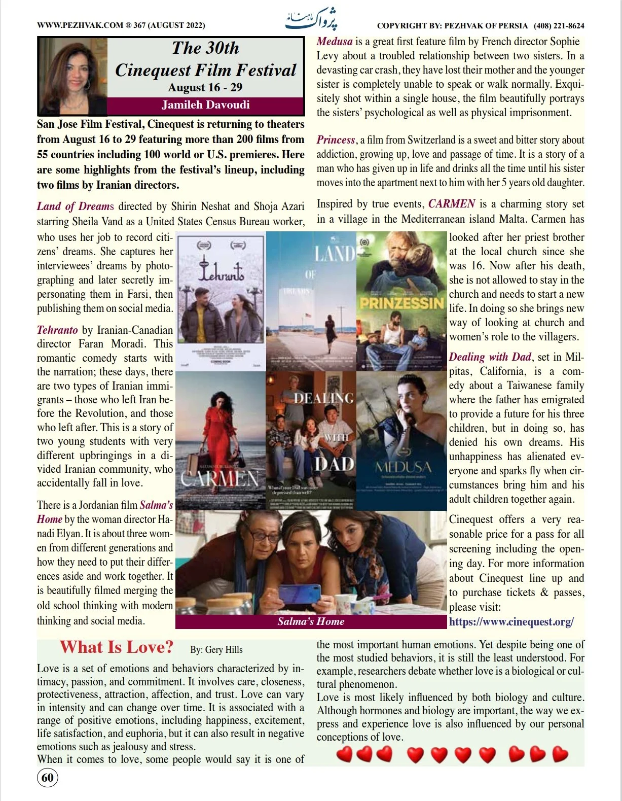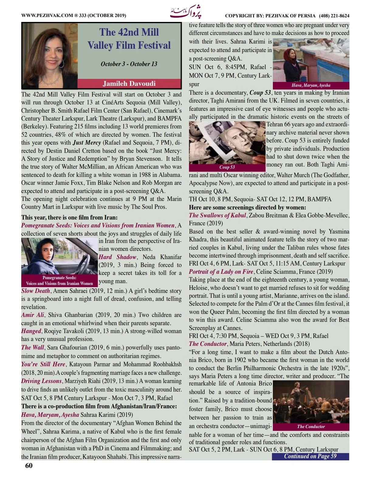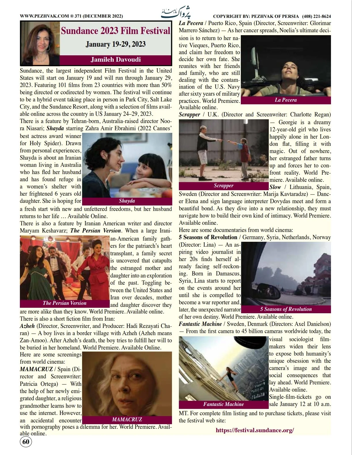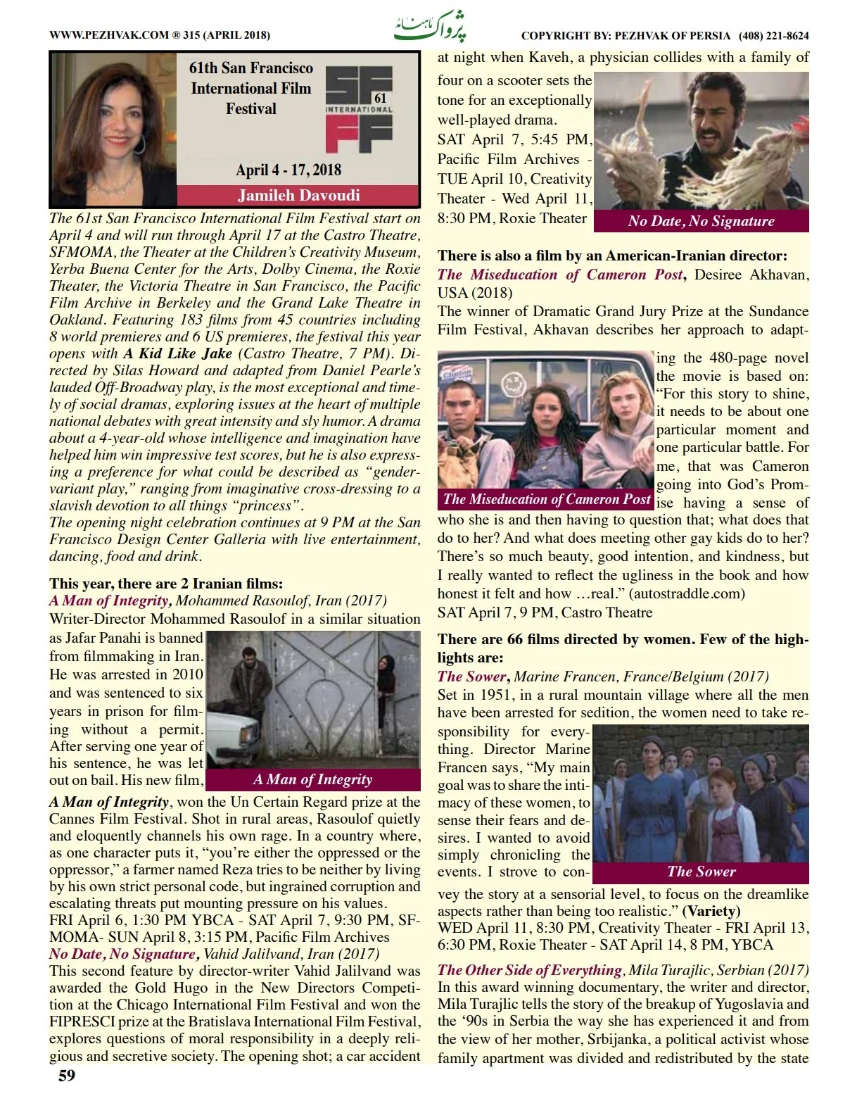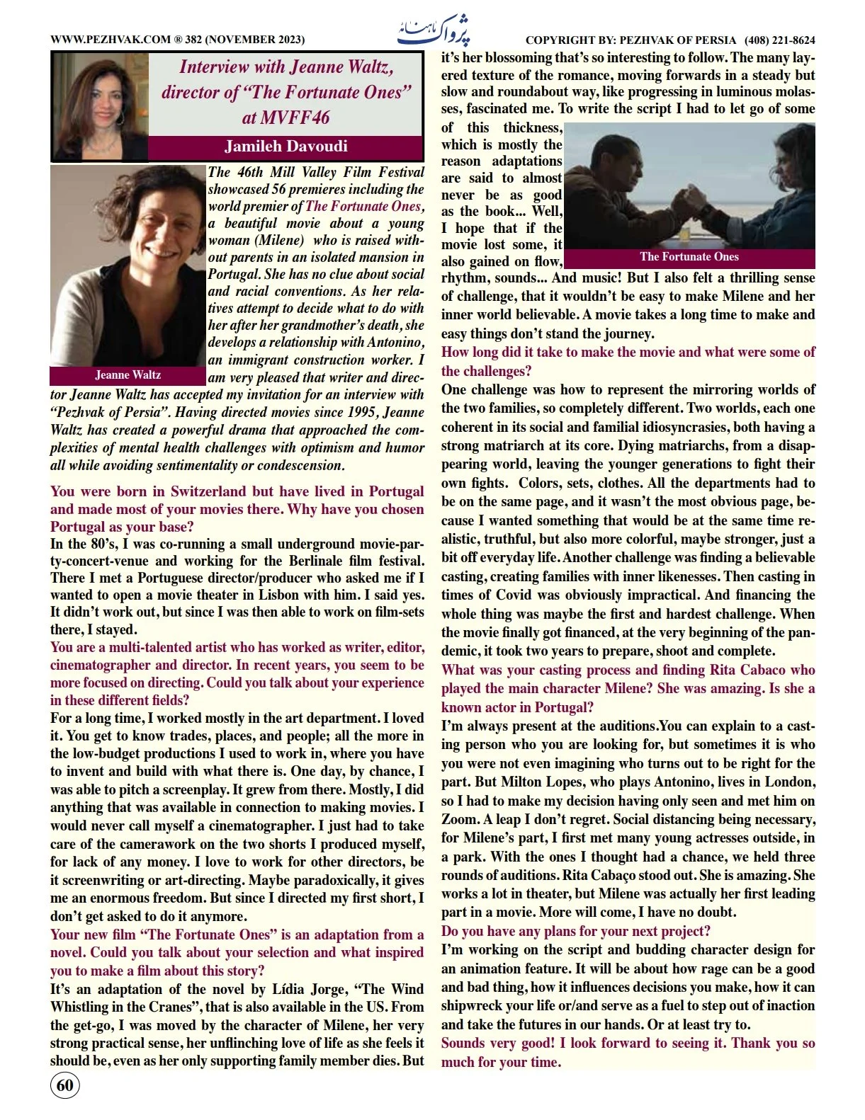 Film Articles… Interviews Interview with Mojgan Ilanlou director of “One Thousand Women” Interview with the director and star of “Me, Maryam, the Children and 26 Others” Interview with Sarra Tsorakidis, director of “Ink Wash” at SFFILM Festival Interview with the directors of “Agent of Happiness” Interview with Kaveh Tehrani director of “Listen Up!” Interview with Azadeh Navai director of “Rizoo” Interview with Kaouther Ben Hania director of “Four Daughters” Interview with Alireza Khatami director of “Terrestrial Verses” Interview with Noor Niasari director of “Shayda” Interview with Jeanne Waltz director of “Fortunate Ones” Interview with Anna Fahr director of “Valley of Exile” Interview with Vadim Perelman director of “Persian Lessons” Interview with Bani Khoshnoudi director of “Transit” Interview with the Iranian Man who Inspired the Film “The Terminal” Interview with Faran Moradi director of “Tehranto” Interview with Gayatri Kumar director of “Coffined at 15” Interview with Kurdwin Ayub director of “Sonne” Interview with Farbod Ardebili director of “Forbidden to See Us Scream in Tehran” Interviews with documentary makers of “Seyran Ates: Sex, Revolution and Islam” Interview with Sahraa Karimi director of “Hava, Maryam, Ayesha” Interview with Iranian-American Actor Sheila Vand Interview with Hossein Amini director of “Two Faces of January” Reviews The 48th Mill Valley Film Festival Growing Trend of Observational Documentaries The 68th SF Film Festival Cinejoy 2025 Cinequest 2025 Spotlight on Three Iranian Women Filmmakers Three Acclaimed Films by Iranian Directors in 2024 The 47th Mill Valley Film Festival Recap The 47th Mill Valley Film Festival Film Reviews: Daddio, Thelma. Ghostlight, Nowhere Special The 67th SF Film Festival CINEJOY 2024 Cinequest 2024 The 46th Mill Valley Film Festival Cinequest 2023 Film Review “Ballad of a White Cow” The 66th SF Film Festival Recap The 66th SF Film Festival The Oscars 2023 Sundance 2023 The 45th Mill Valley Film Festival Recap The 45th Mill Valley Film Festival Cinequest 2022 The 65th SF Film Festival + Interview with Sally Rubin director of “Mama Has a Mustache” The 44th Mill Valley Film Festival Recap The 44th Mill Valley Film Festival The 64th SF Film Festival The 42nd Mill Valley Film Festival The 62nd SF Film Festival Recap The 62nd SF Film Festival The 61st SF Film Festival The 60th SF Film Festival Recap The 60th SF Film Festival The 59th SF Film Festival Recap The 59th SF Film Festival The 58th SF Film Festival Recap The 58th SF Film Festival The 57th SF Film Festival Recap The 57th SF Film Festival