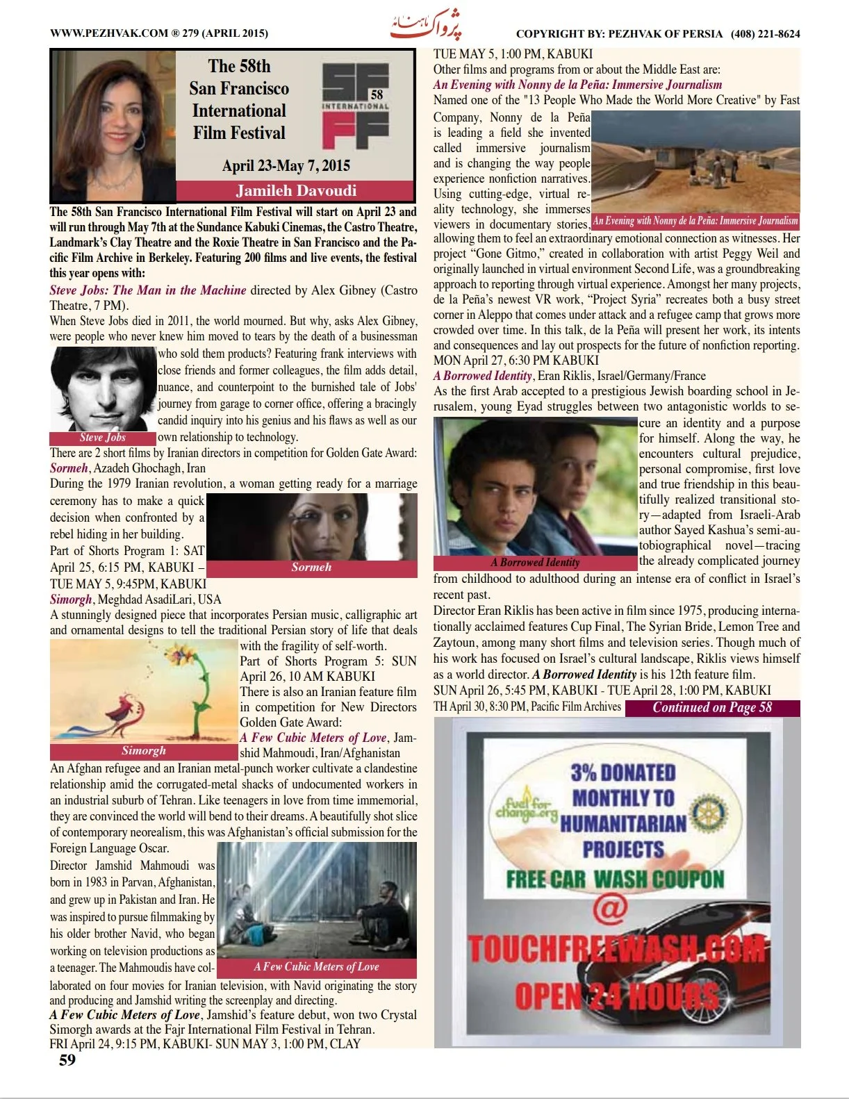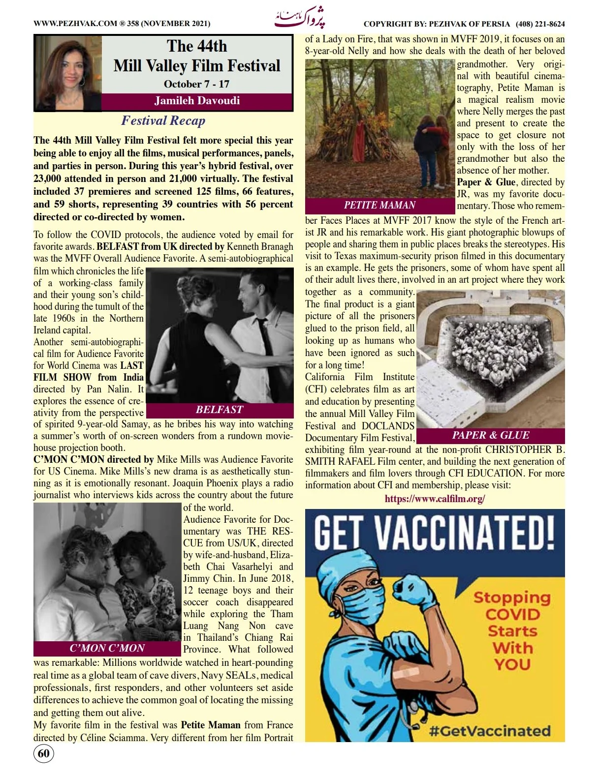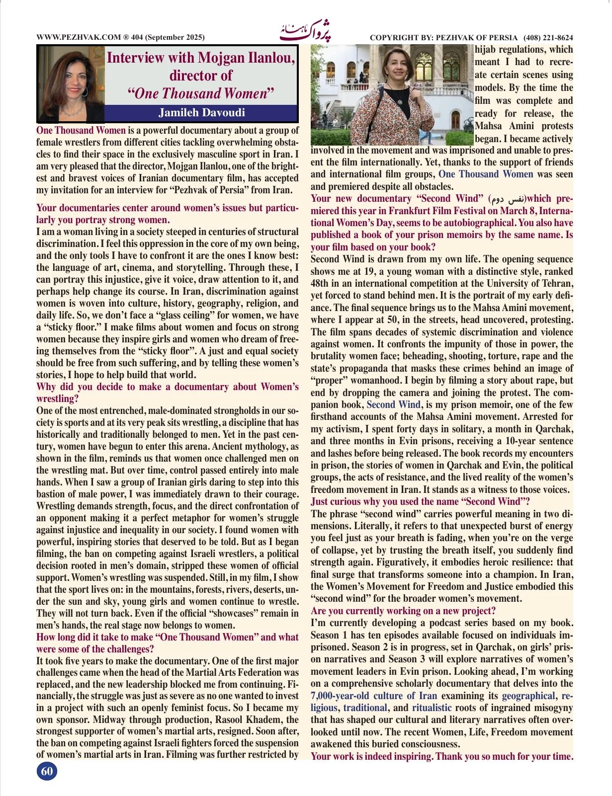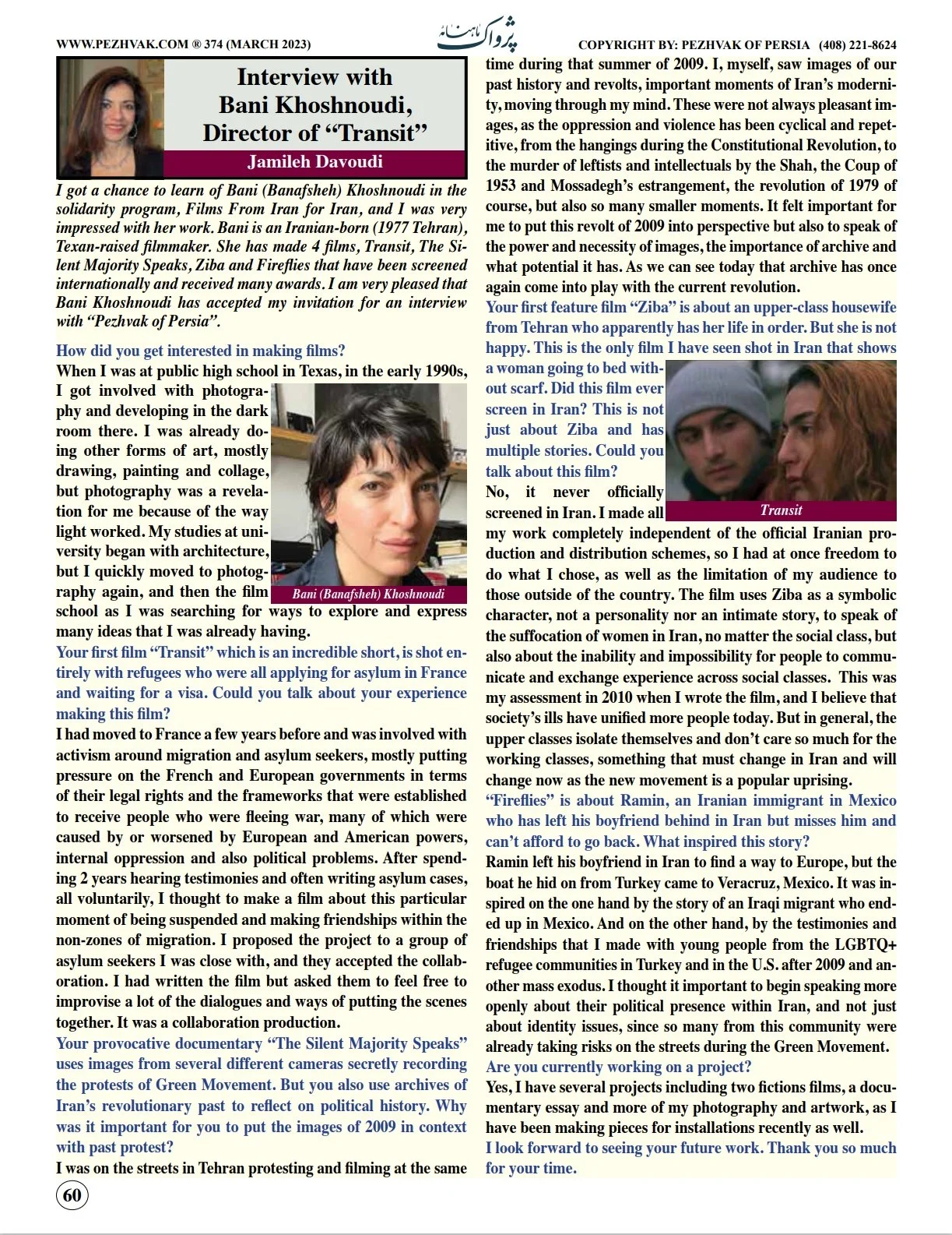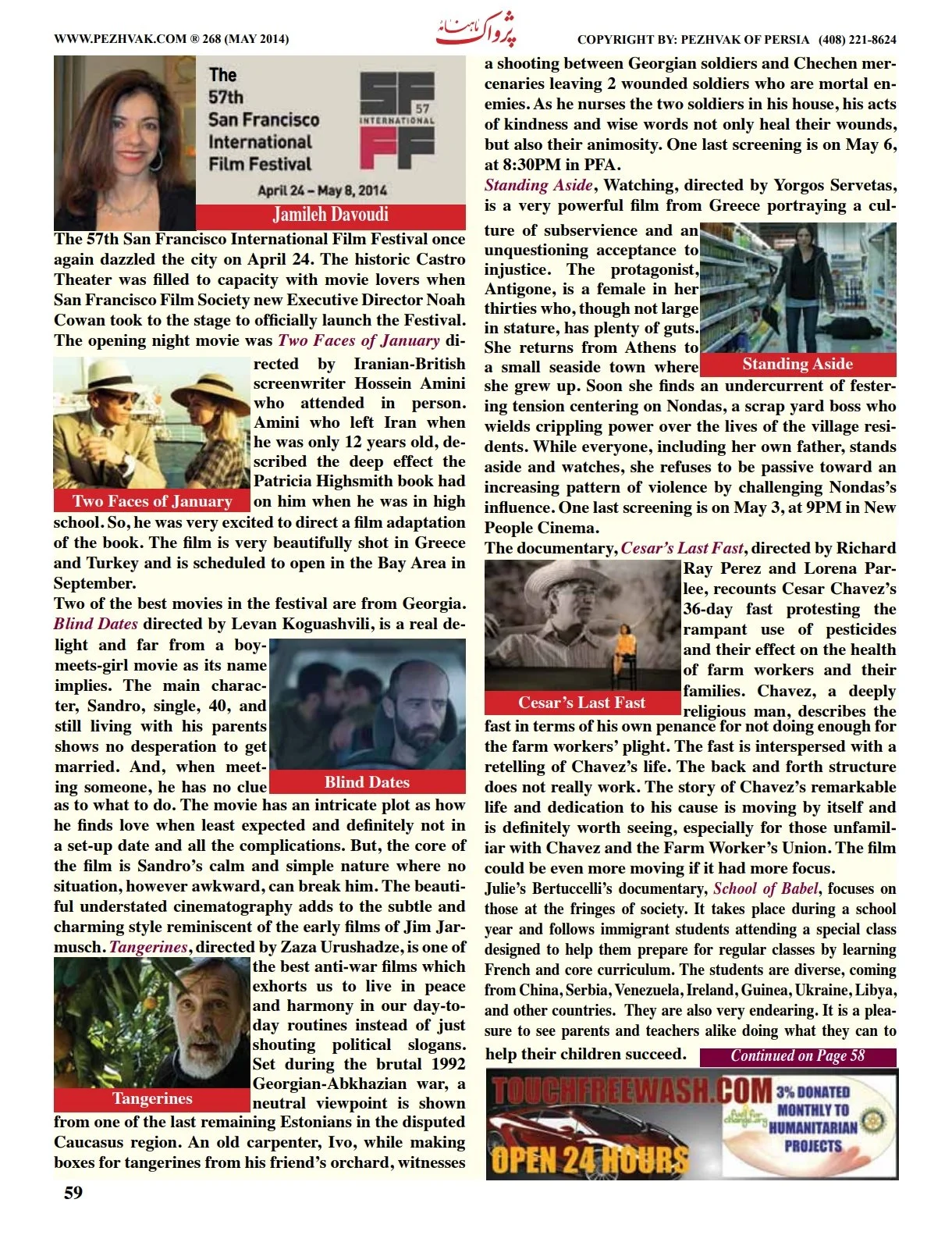 Film Articles… Interviews Interview with Mojgan Ilanlou director of “One Thousand Women” Interview with the director and star of “Me, Maryam, the Children and 26 Others” Interview with Sarra Tsorakidis, director of “Ink Wash” at SFFILM Festival Interview with the directors of “Agent of Happiness” Interview with Kaveh Tehrani director of “Listen Up!” Interview with Azadeh Navai director of “Rizoo” Interview with Kaouther Ben Hania director of “Four Daughters” Interview with Alireza Khatami director of “Terrestrial Verses” Interview with Noor Niasari director of “Shayda” Interview with Jeanne Waltz director of “Fortunate Ones” Interview with Anna Fahr director of “Valley of Exile” Interview with Vadim Perelman director of “Persian Lessons” Interview with Bani Khoshnoudi director of “Transit” Interview with the Iranian Man who Inspired the Film “The Terminal” Interview with Faran Moradi director of “Tehranto” Interview with Gayatri Kumar director of “Coffined at 15” Interview with Kurdwin Ayub director of “Sonne” Interview with Farbod Ardebili director of “Forbidden to See Us Scream in Tehran” Interviews with documentary makers of “Seyran Ates: Sex, Revolution and Islam” Interview with Sahraa Karimi director of “Hava, Maryam, Ayesha” Interview with Iranian-American Actor Sheila Vand Interview with Hossein Amini director of “Two Faces of January” Reviews The 48th Mill Valley Film Festival Growing Trend of Observational Documentaries The 68th SF Film Festival Cinejoy 2025 Cinequest 2025 Spotlight on Three Iranian Women Filmmakers Three Acclaimed Films by Iranian Directors in 2024 The 47th Mill Valley Film Festival Recap The 47th Mill Valley Film Festival Film Reviews: Daddio, Thelma. Ghostlight, Nowhere Special The 67th SF Film Festival CINEJOY 2024 Cinequest 2024 The 46th Mill Valley Film Festival Cinequest 2023 Film Review “Ballad of a White Cow” The 66th SF Film Festival Recap The 66th SF Film Festival The Oscars 2023 Sundance 2023 The 45th Mill Valley Film Festival Recap The 45th Mill Valley Film Festival Cinequest 2022 The 65th SF Film Festival + Interview with Sally Rubin director of “Mama Has a Mustache” The 44th Mill Valley Film Festival Recap The 44th Mill Valley Film Festival The 64th SF Film Festival The 42nd Mill Valley Film Festival The 62nd SF Film Festival Recap The 62nd SF Film Festival The 61st SF Film Festival The 60th SF Film Festival Recap The 60th SF Film Festival The 59th SF Film Festival Recap The 59th SF Film Festival The 58th SF Film Festival Recap The 58th SF Film Festival The 57th SF Film Festival Recap The 57th SF Film Festival