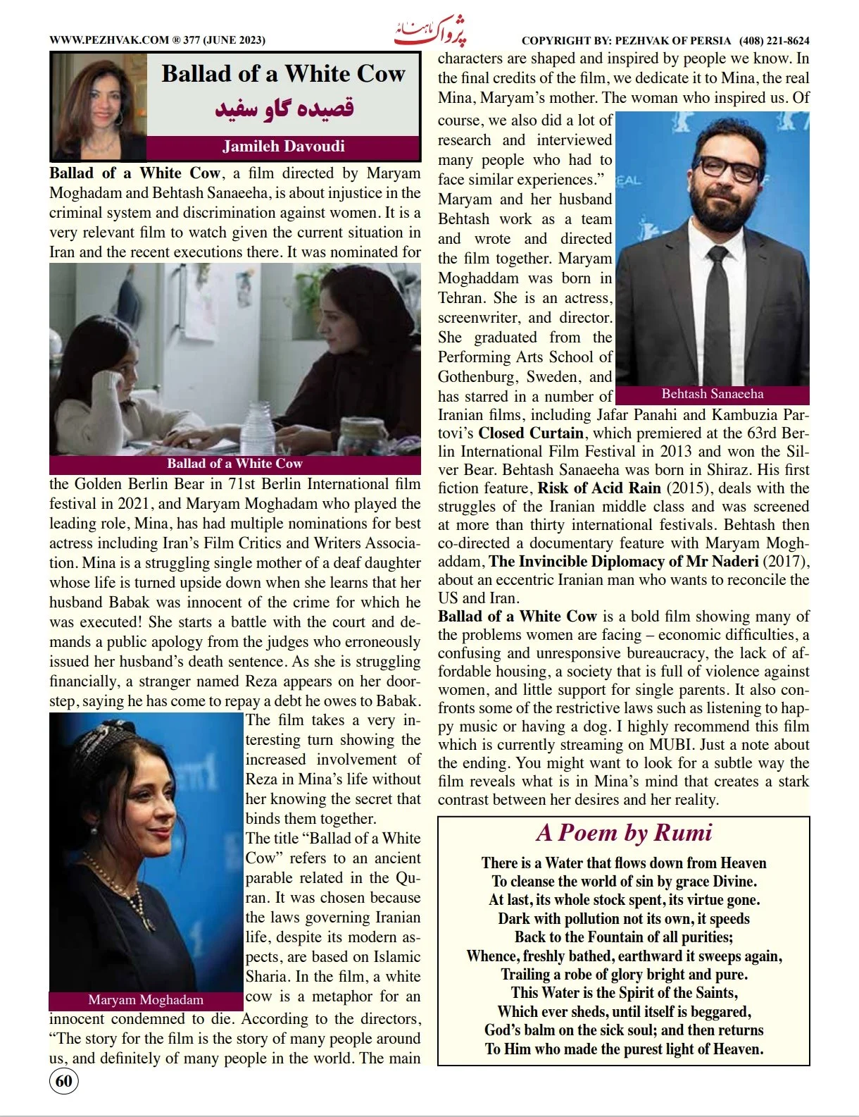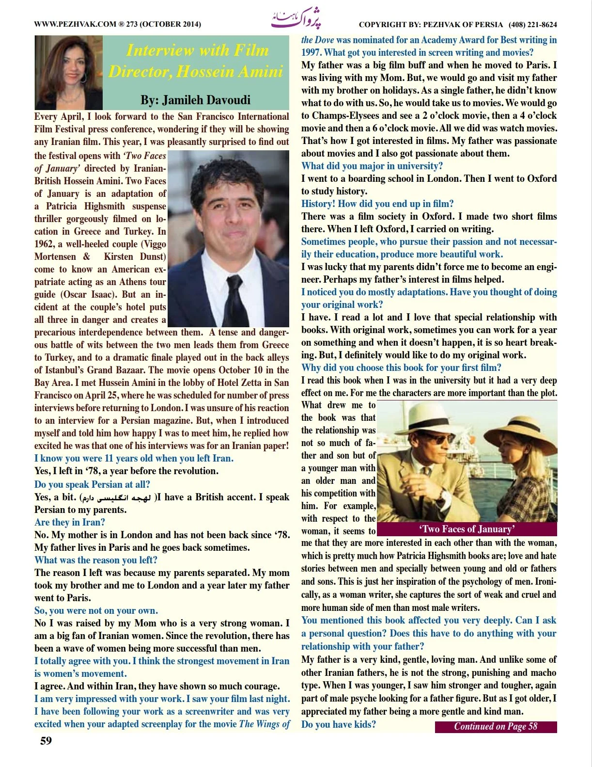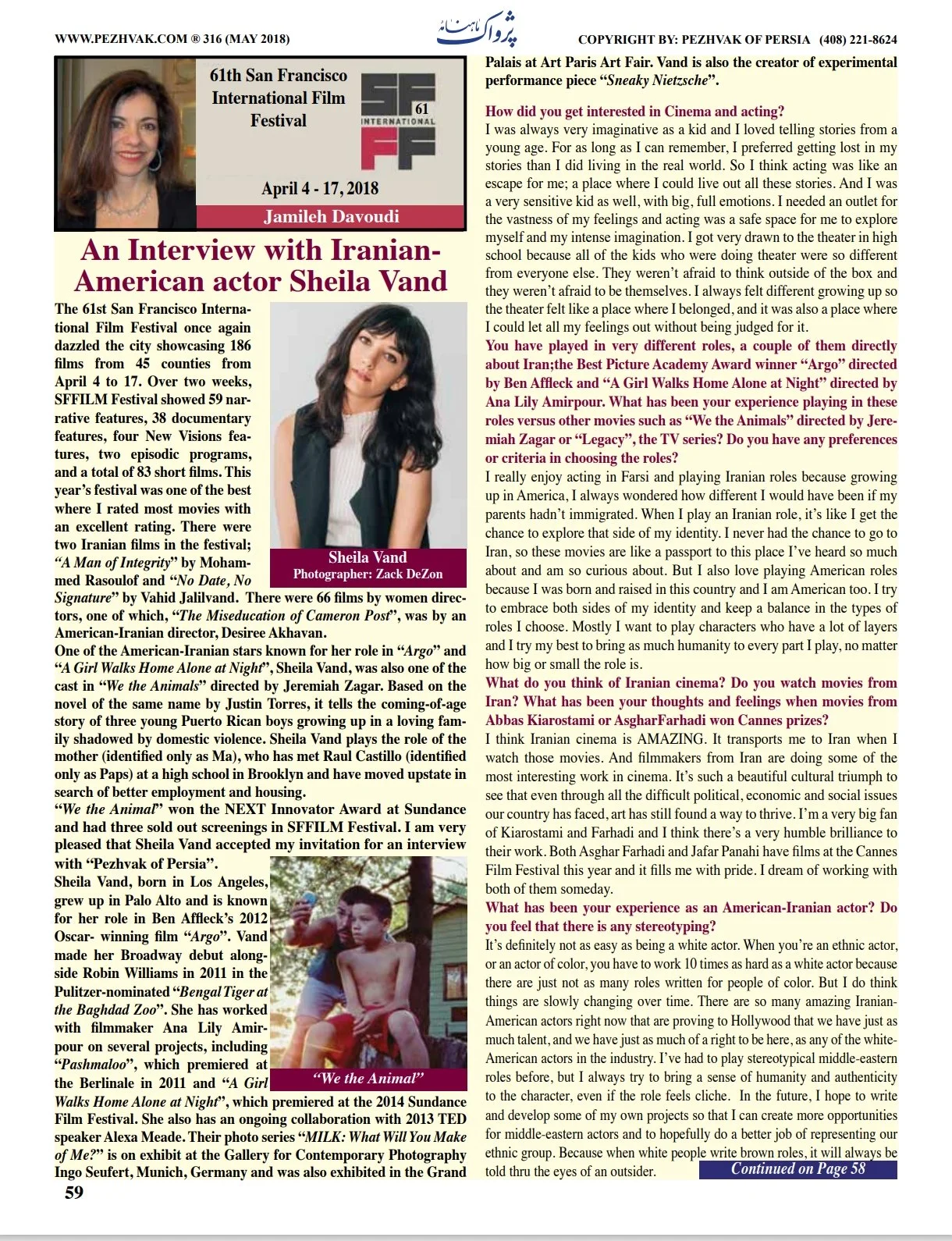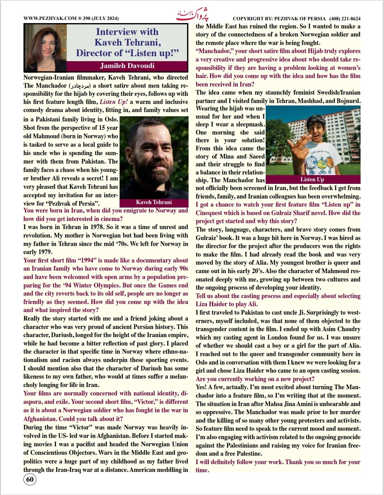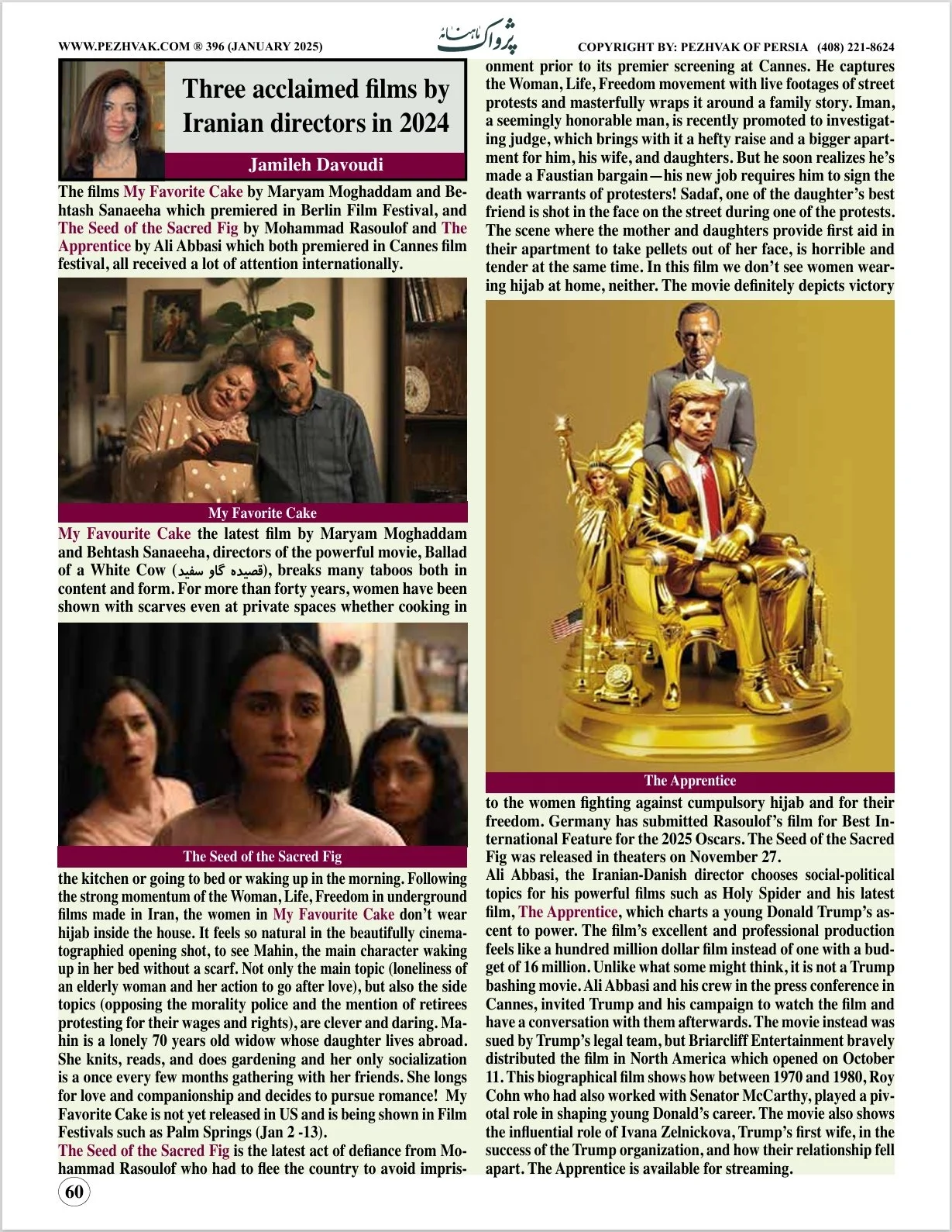 Film Articles… Interviews Interview with Mojgan Ilanlou director of “One Thousand Women” Interview with the director and star of “Me, Maryam, the Children and 26 Others” Interview with Sarra Tsorakidis, director of “Ink Wash” at SFFILM Festival Interview with the directors of “Agent of Happiness” Interview with Kaveh Tehrani director of “Listen Up!” Interview with Azadeh Navai director of “Rizoo” Interview with Kaouther Ben Hania director of “Four Daughters” Interview with Alireza Khatami director of “Terrestrial Verses” Interview with Noor Niasari director of “Shayda” Interview with Jeanne Waltz director of “Fortunate Ones” Interview with Anna Fahr director of “Valley of Exile” Interview with Vadim Perelman director of “Persian Lessons” Interview with Bani Khoshnoudi director of “Transit” Interview with the Iranian Man who Inspired the Film “The Terminal” Interview with Faran Moradi director of “Tehranto” Interview with Gayatri Kumar director of “Coffined at 15” Interview with Kurdwin Ayub director of “Sonne” Interview with Farbod Ardebili director of “Forbidden to See Us Scream in Tehran” Interviews with documentary makers of “Seyran Ates: Sex, Revolution and Islam” Interview with Sahraa Karimi director of “Hava, Maryam, Ayesha” Interview with Iranian-American Actor Sheila Vand Interview with Hossein Amini director of “Two Faces of January” Reviews The 48th Mill Valley Film Festival Growing Trend of Observational Documentaries The 68th SF Film Festival Cinejoy 2025 Cinequest 2025 Spotlight on Three Iranian Women Filmmakers Three Acclaimed Films by Iranian Directors in 2024 The 47th Mill Valley Film Festival Recap The 47th Mill Valley Film Festival Film Reviews: Daddio, Thelma. Ghostlight, Nowhere Special The 67th SF Film Festival CINEJOY 2024 Cinequest 2024 The 46th Mill Valley Film Festival Cinequest 2023 Film Review “Ballad of a White Cow” The 66th SF Film Festival Recap The 66th SF Film Festival The Oscars 2023 Sundance 2023 The 45th Mill Valley Film Festival Recap The 45th Mill Valley Film Festival Cinequest 2022 The 65th SF Film Festival + Interview with Sally Rubin director of “Mama Has a Mustache” The 44th Mill Valley Film Festival Recap The 44th Mill Valley Film Festival The 64th SF Film Festival The 42nd Mill Valley Film Festival The 62nd SF Film Festival Recap The 62nd SF Film Festival The 61st SF Film Festival The 60th SF Film Festival Recap The 60th SF Film Festival The 59th SF Film Festival Recap The 59th SF Film Festival The 58th SF Film Festival Recap The 58th SF Film Festival The 57th SF Film Festival Recap The 57th SF Film Festival