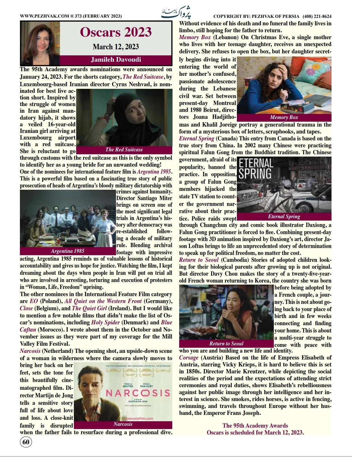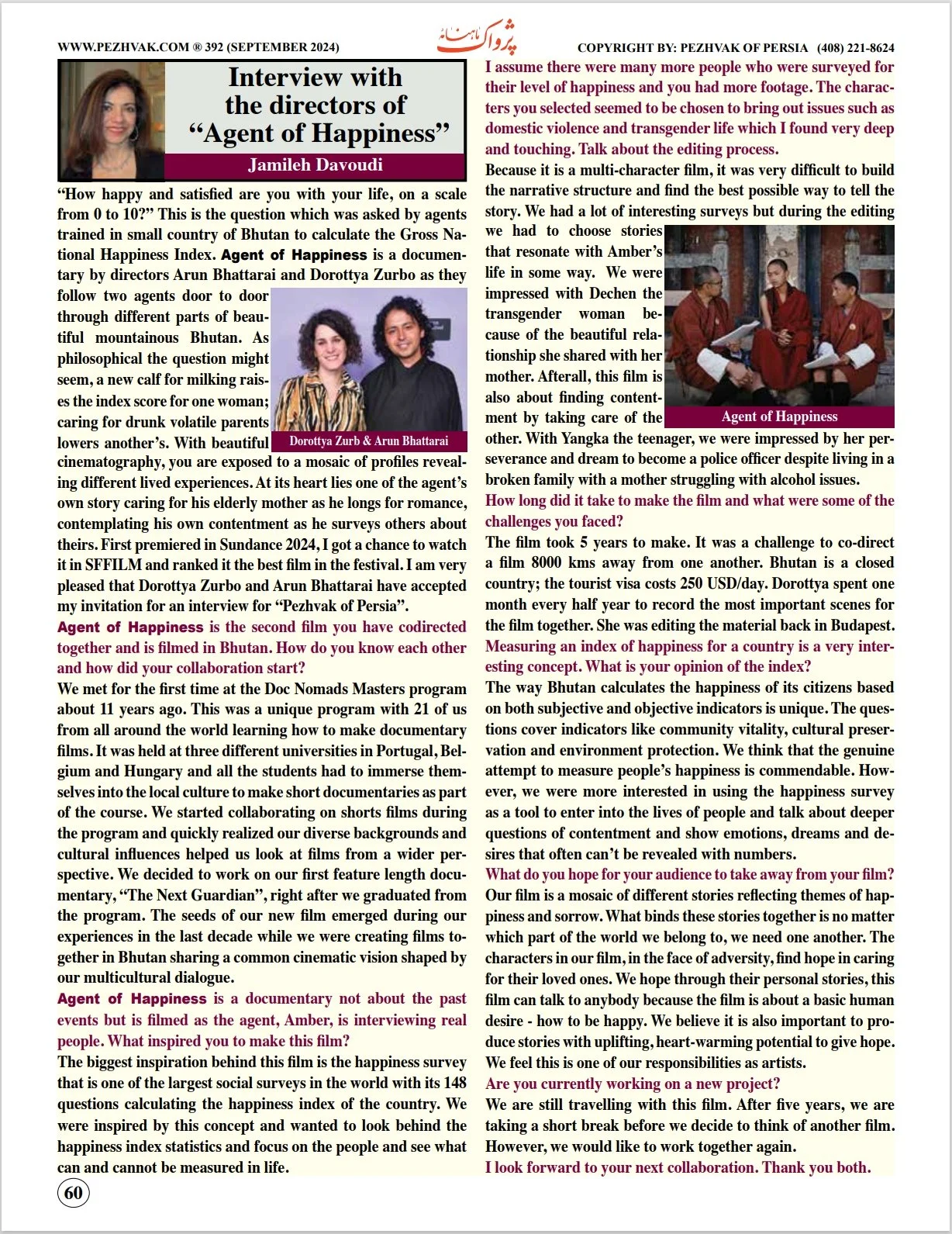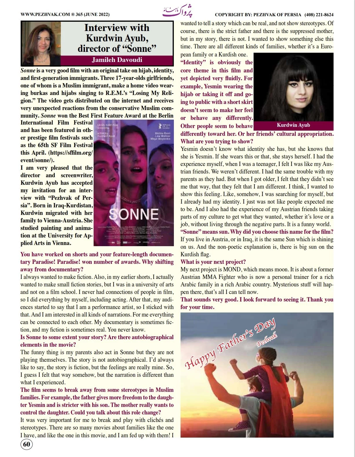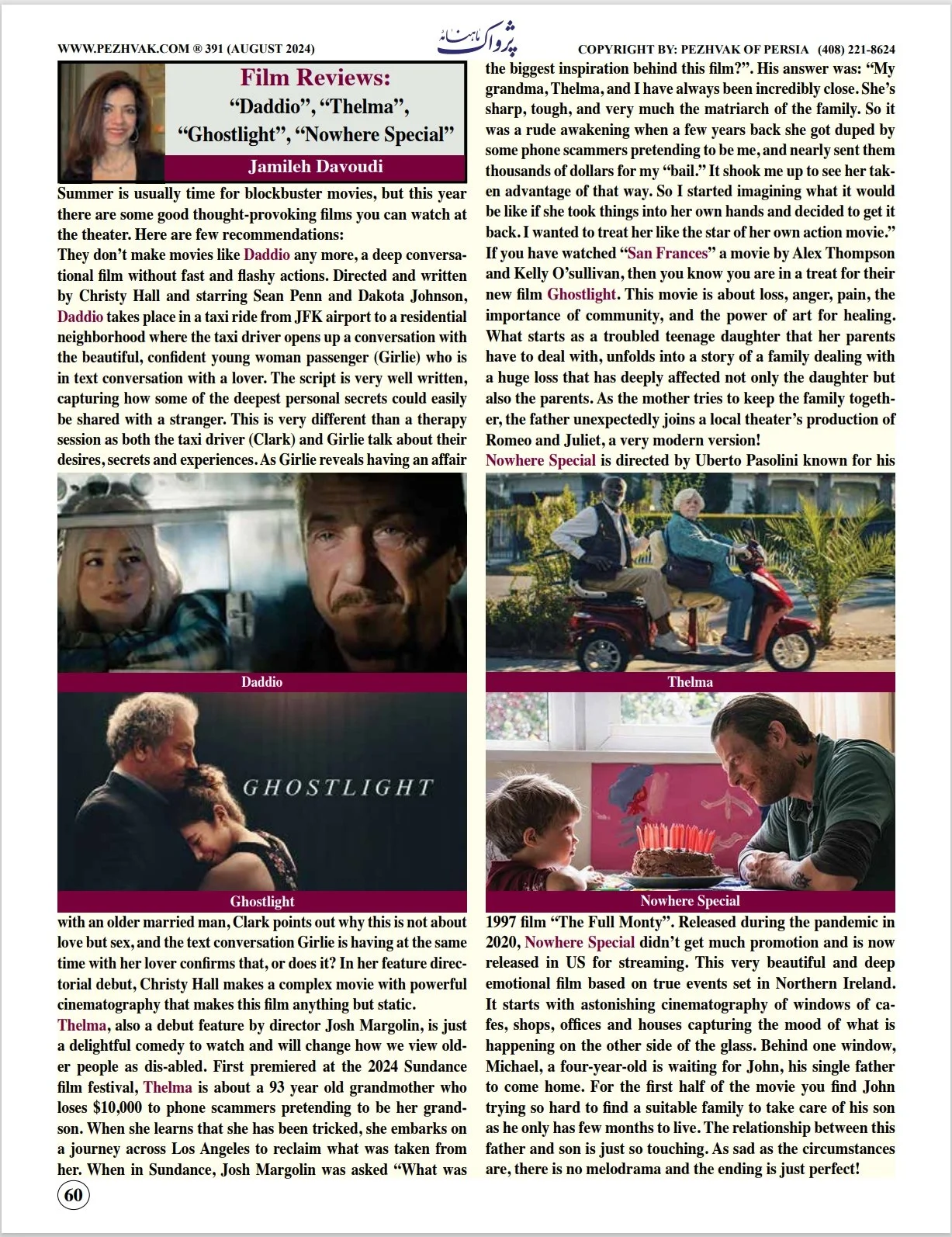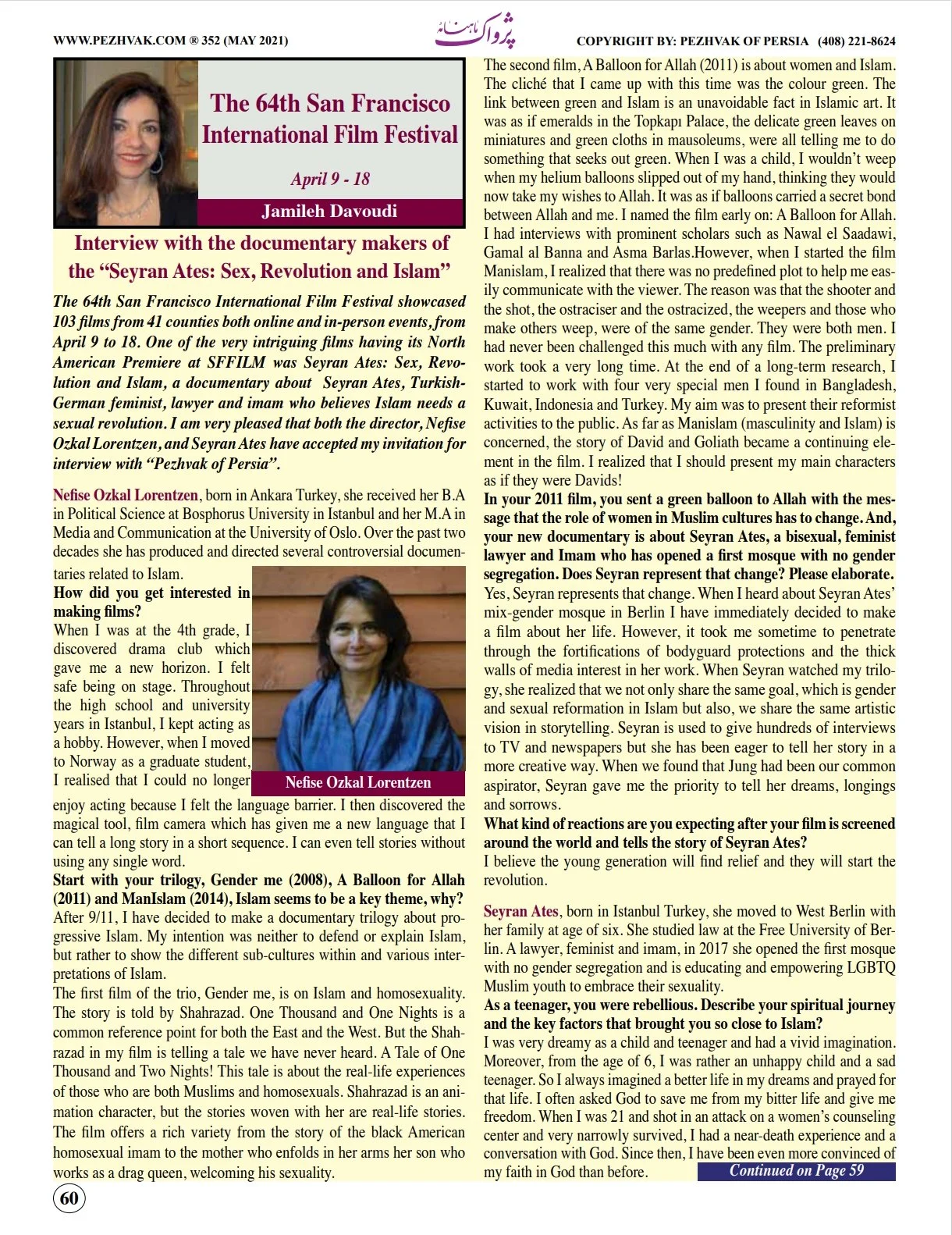 Film Articles… Interviews Interview with Mojgan Ilanlou director of “One Thousand Women” Interview with the director and star of “Me, Maryam, the Children and 26 Others” Interview with Sarra Tsorakidis, director of “Ink Wash” at SFFILM Festival Interview with the directors of “Agent of Happiness” Interview with Kaveh Tehrani director of “Listen Up!” Interview with Azadeh Navai director of “Rizoo” Interview with Kaouther Ben Hania director of “Four Daughters” Interview with Alireza Khatami director of “Terrestrial Verses” Interview with Noor Niasari director of “Shayda” Interview with Jeanne Waltz director of “Fortunate Ones” Interview with Anna Fahr director of “Valley of Exile” Interview with Vadim Perelman director of “Persian Lessons” Interview with Bani Khoshnoudi director of “Transit” Interview with the Iranian Man who Inspired the Film “The Terminal” Interview with Faran Moradi director of “Tehranto” Interview with Gayatri Kumar director of “Coffined at 15” Interview with Kurdwin Ayub director of “Sonne” Interview with Farbod Ardebili director of “Forbidden to See Us Scream in Tehran” Interviews with documentary makers of “Seyran Ates: Sex, Revolution and Islam” Interview with Sahraa Karimi director of “Hava, Maryam, Ayesha” Interview with Iranian-American Actor Sheila Vand Interview with Hossein Amini director of “Two Faces of January” Reviews The 48th Mill Valley Film Festival Growing Trend of Observational Documentaries The 68th SF Film Festival Cinejoy 2025 Cinequest 2025 Spotlight on Three Iranian Women Filmmakers Three Acclaimed Films by Iranian Directors in 2024 The 47th Mill Valley Film Festival Recap The 47th Mill Valley Film Festival Film Reviews: Daddio, Thelma. Ghostlight, Nowhere Special The 67th SF Film Festival CINEJOY 2024 Cinequest 2024 The 46th Mill Valley Film Festival Cinequest 2023 Film Review “Ballad of a White Cow” The 66th SF Film Festival Recap The 66th SF Film Festival The Oscars 2023 Sundance 2023 The 45th Mill Valley Film Festival Recap The 45th Mill Valley Film Festival Cinequest 2022 The 65th SF Film Festival + Interview with Sally Rubin director of “Mama Has a Mustache” The 44th Mill Valley Film Festival Recap The 44th Mill Valley Film Festival The 64th SF Film Festival The 42nd Mill Valley Film Festival The 62nd SF Film Festival Recap The 62nd SF Film Festival The 61st SF Film Festival The 60th SF Film Festival Recap The 60th SF Film Festival The 59th SF Film Festival Recap The 59th SF Film Festival The 58th SF Film Festival Recap The 58th SF Film Festival The 57th SF Film Festival Recap The 57th SF Film Festival