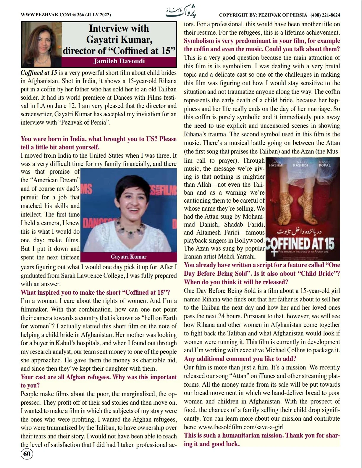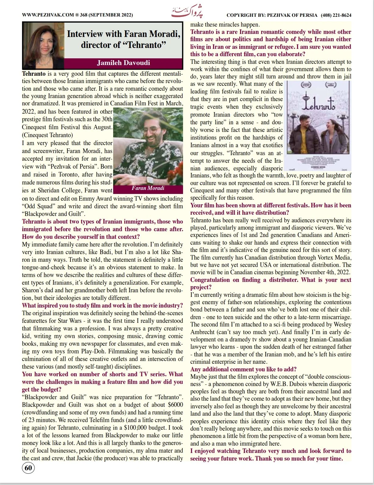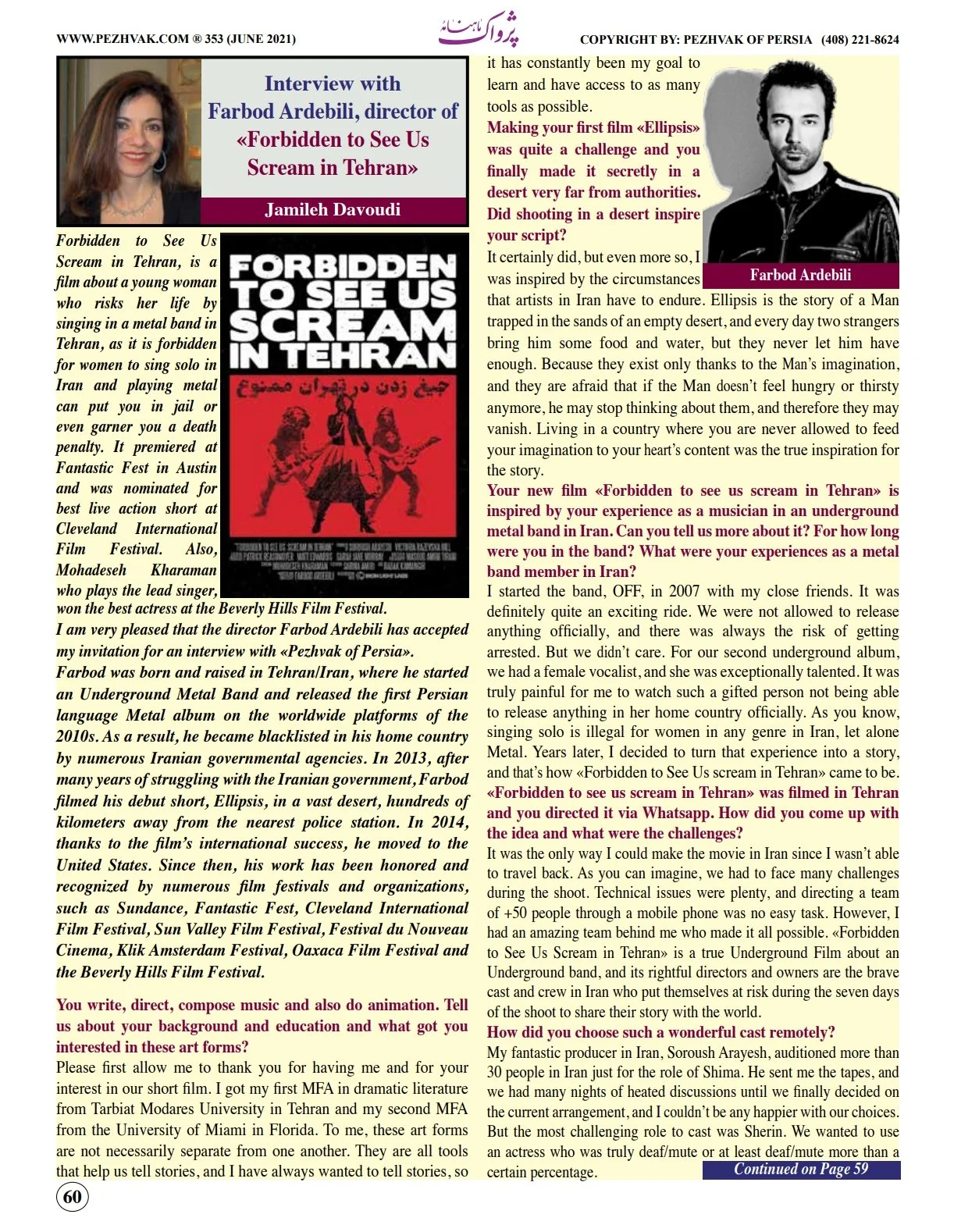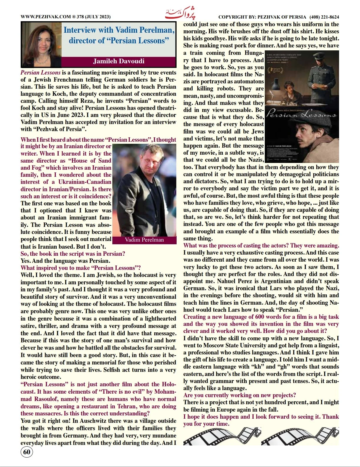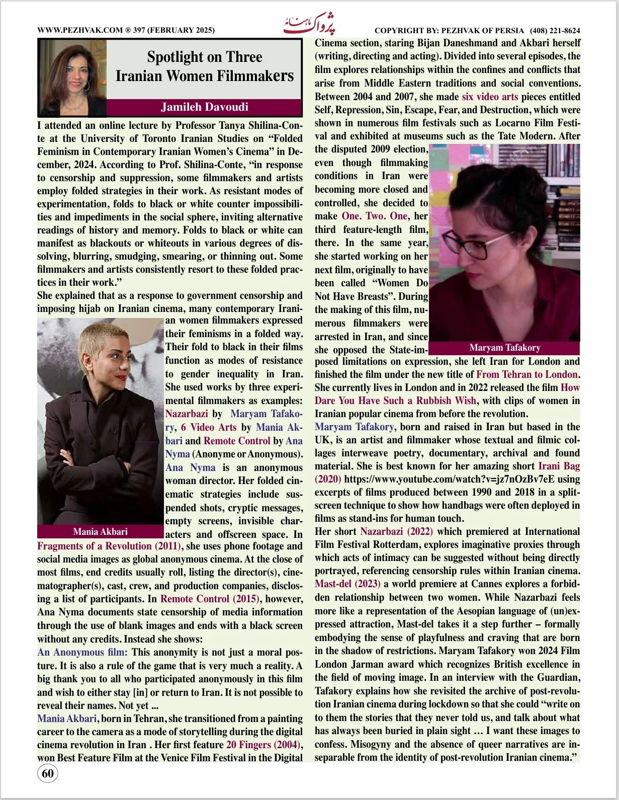 Film Articles… Interviews Interview with Mojgan Ilanlou director of “One Thousand Women” Interview with the director and star of “Me, Maryam, the Children and 26 Others” Interview with Sarra Tsorakidis, director of “Ink Wash” at SFFILM Festival Interview with the directors of “Agent of Happiness” Interview with Kaveh Tehrani director of “Listen Up!” Interview with Azadeh Navai director of “Rizoo” Interview with Kaouther Ben Hania director of “Four Daughters” Interview with Alireza Khatami director of “Terrestrial Verses” Interview with Noor Niasari director of “Shayda” Interview with Jeanne Waltz director of “Fortunate Ones” Interview with Anna Fahr director of “Valley of Exile” Interview with Vadim Perelman director of “Persian Lessons” Interview with Bani Khoshnoudi director of “Transit” Interview with the Iranian Man who Inspired the Film “The Terminal” Interview with Faran Moradi director of “Tehranto” Interview with Gayatri Kumar director of “Coffined at 15” Interview with Kurdwin Ayub director of “Sonne” Interview with Farbod Ardebili director of “Forbidden to See Us Scream in Tehran” Interviews with documentary makers of “Seyran Ates: Sex, Revolution and Islam” Interview with Sahraa Karimi director of “Hava, Maryam, Ayesha” Interview with Iranian-American Actor Sheila Vand Interview with Hossein Amini director of “Two Faces of January” Reviews The 48th Mill Valley Film Festival Growing Trend of Observational Documentaries The 68th SF Film Festival Cinejoy 2025 Cinequest 2025 Spotlight on Three Iranian Women Filmmakers Three Acclaimed Films by Iranian Directors in 2024 The 47th Mill Valley Film Festival Recap The 47th Mill Valley Film Festival Film Reviews: Daddio, Thelma. Ghostlight, Nowhere Special The 67th SF Film Festival CINEJOY 2024 Cinequest 2024 The 46th Mill Valley Film Festival Cinequest 2023 Film Review “Ballad of a White Cow” The 66th SF Film Festival Recap The 66th SF Film Festival The Oscars 2023 Sundance 2023 The 45th Mill Valley Film Festival Recap The 45th Mill Valley Film Festival Cinequest 2022 The 65th SF Film Festival + Interview with Sally Rubin director of “Mama Has a Mustache” The 44th Mill Valley Film Festival Recap The 44th Mill Valley Film Festival The 64th SF Film Festival The 42nd Mill Valley Film Festival The 62nd SF Film Festival Recap The 62nd SF Film Festival The 61st SF Film Festival The 60th SF Film Festival Recap The 60th SF Film Festival The 59th SF Film Festival Recap The 59th SF Film Festival The 58th SF Film Festival Recap The 58th SF Film Festival The 57th SF Film Festival Recap The 57th SF Film Festival