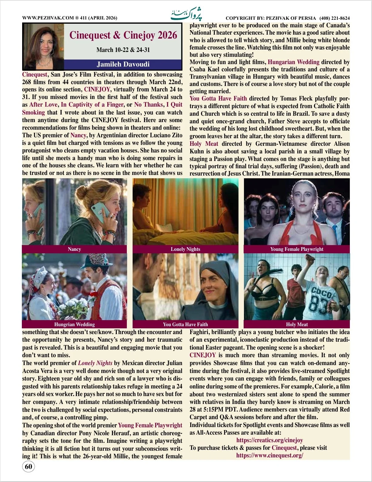 Film Articles… Interviews Interview with Award Winning Actress, Behdokht Valian Interview with Sepideh Farsi, director of “Put Your Soul on Your Hand and Walk” Interview with Mojgan Ilanlou director of “One Thousand Women” Interview with the director and star of “Me, Maryam, the Children and 26 Others” Interview with Sarra Tsorakidis, director of “Ink Wash” at SFFILM Festival Interview with the directors of “Agent of Happiness” Interview with Kaveh Tehrani director of “Listen Up!” Interview with Azadeh Navai director of “Rizoo” Interview with Kaouther Ben Hania director of “Four Daughters” Interview with Alireza Khatami director of “Terrestrial Verses” Interview with Noor Niasari director of “Shayda” Interview with Jeanne Waltz director of “Fortunate Ones” Interview with Anna Fahr director of “Valley of Exile” Interview with Vadim Perelman director of “Persian Lessons” Interview with Bani Khoshnoudi director of “Transit” Interview with the Iranian Man who Inspired the Film “The Terminal” Interview with Faran Moradi director of “Tehranto” Interview with Gayatri Kumar director of “Coffined at 15” Interview with Kurdwin Ayub director of “Sonne” Interview with Farbod Ardebili director of “Forbidden to See Us Scream in Tehran” Interviews with documentary makers of “Seyran Ates: Sex, Revolution and Islam” Interview with Sahraa Karimi director of “Hava, Maryam, Ayesha” Interview with Iranian-American Actor Sheila Vand Interview with Hossein Amini director of “Two Faces of January” Reviews Cinequest & Cinejoy 2026 Cinequest 2026 A Tribute to Filmmaker & Scholar, Bahram Beyzaei (1938 - 2025) The 48th Mill Valley Film Festival Recap The 48th Mill Valley Film Festival Growing Trend of Observational Documentaries The 68th SF Film Festival Cinejoy 2025 Cinequest 2025 Spotlight on Three Iranian Women Filmmakers Three Acclaimed Films by Iranian Directors in 2024 The 47th Mill Valley Film Festival Recap The 47th Mill Valley Film Festival Film Reviews: Daddio, Thelma. Ghostlight, Nowhere Special The 67th SF Film Festival CINEJOY 2024 Cinequest 2024 The 46th Mill Valley Film Festival Cinequest 2023 Film Review “Ballad of a White Cow” The 66th SF Film Festival Recap The 66th SF Film Festival The Oscars 2023 Sundance 2023 The 45th Mill Valley Film Festival Recap The 45th Mill Valley Film Festival Cinequest 2022 The 65th SF Film Festival + Interview with Sally Rubin director of “Mama Has a Mustache” The 44th Mill Valley Film Festival Recap The 44th Mill Valley Film Festival The 64th SF Film Festival The 42nd Mill Valley Film Festival The 62nd SF Film Festival Recap The 62nd SF Film Festival The 61st SF Film Festival The 60th SF Film Festival Recap The 60th SF Film Festival The 59th SF Film Festival Recap The 59th SF Film Festival The 58th SF Film Festival Recap The 58th SF Film Festival The 57th SF Film Festival Recap The 57th SF Film Festival